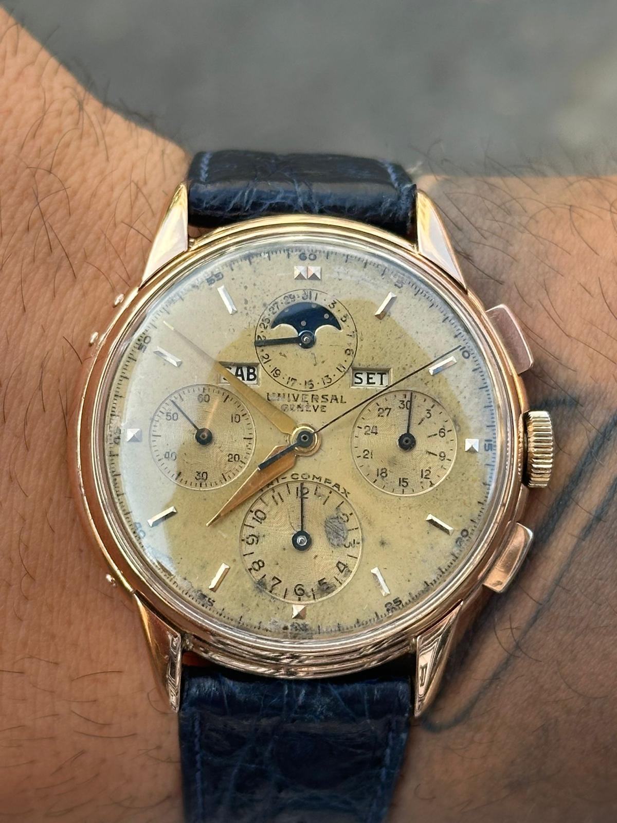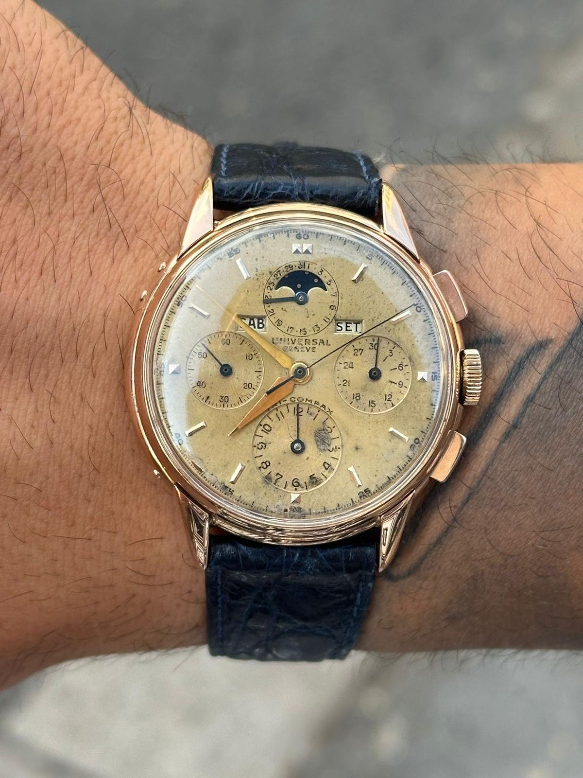 Marca Universal Genève Modello (Orologio) Compax Numero di referenza Universal genève 12553 Carica Manuale Materiale della cassa Oro rosa Materiale cinturino Pelle di coccodrillo Anno di produzione 1950 Condizione Usato (Buono) L'articolo presenta segni di usura percepibili alla vista e al tatto, come graffi, scalfitture o piccole ammaccature. Corredo Senza scatola originale né documenti originali Genere Orologio da uomo/Unisex Calibro Carica Manuale Cassa Materiale della cassa Oro rosa Diametro 38 mm Quadrante Champagne Cinturino Materiale cinturino Pelle di coccodrillo