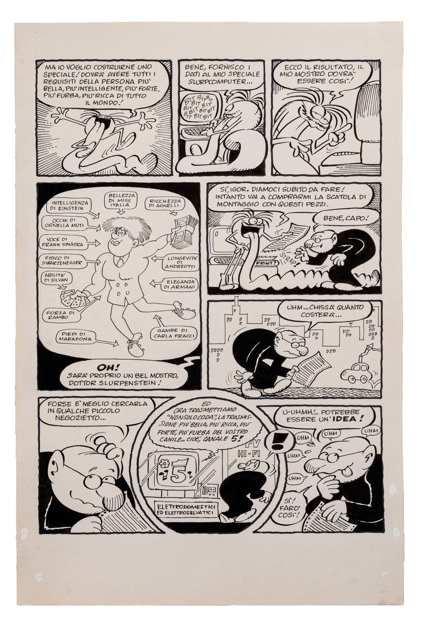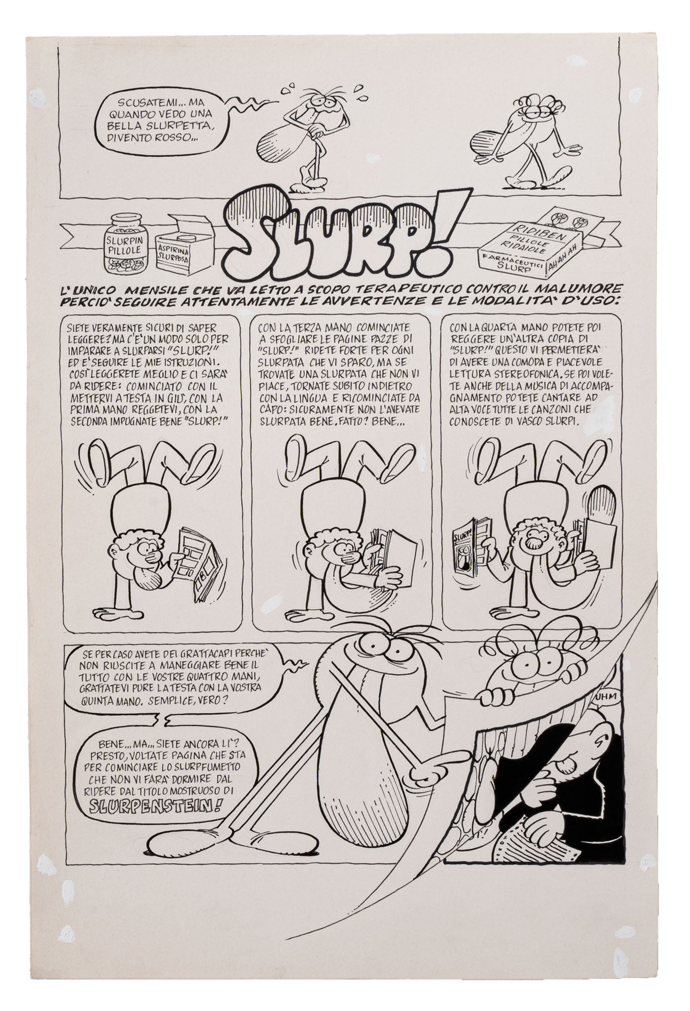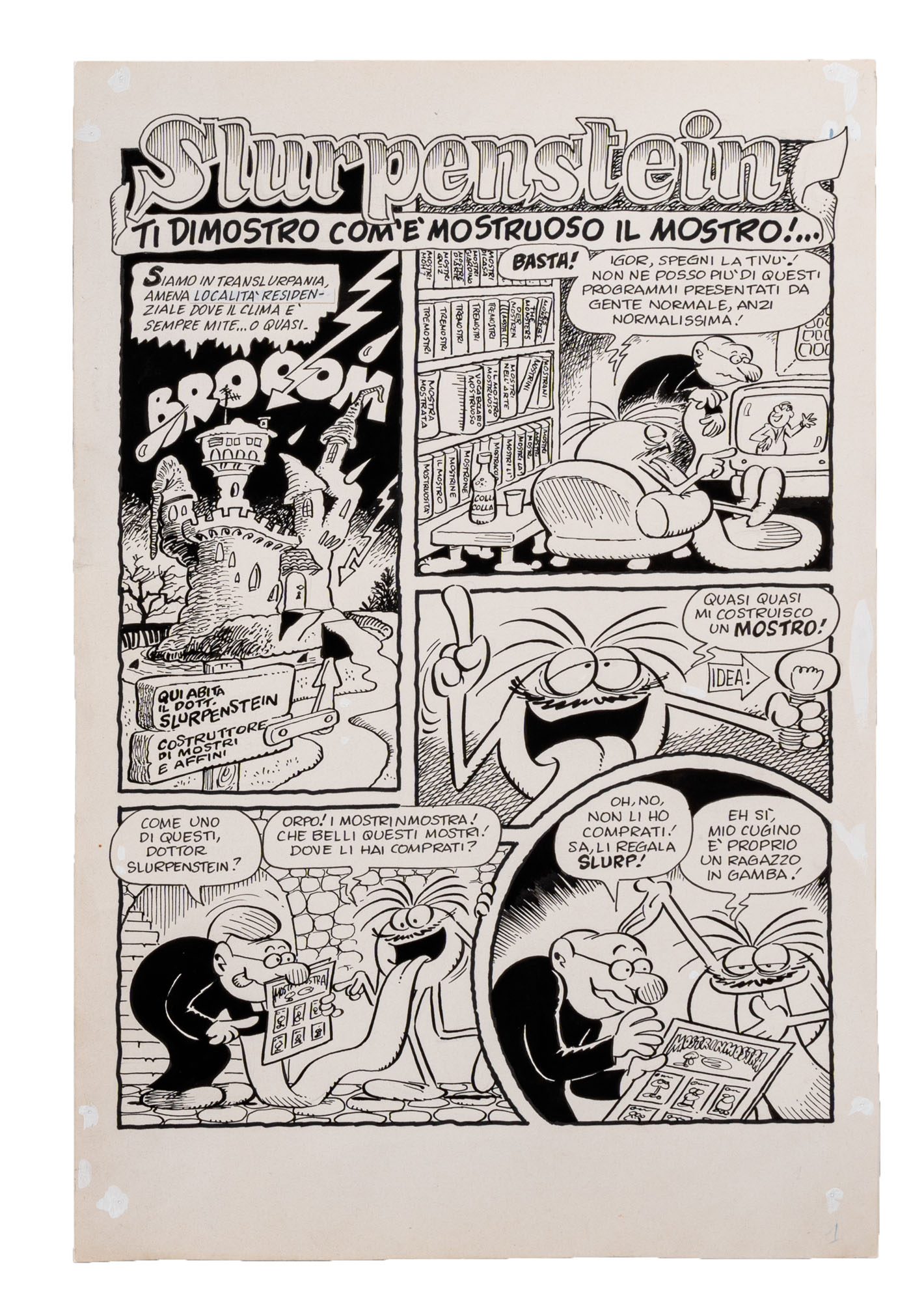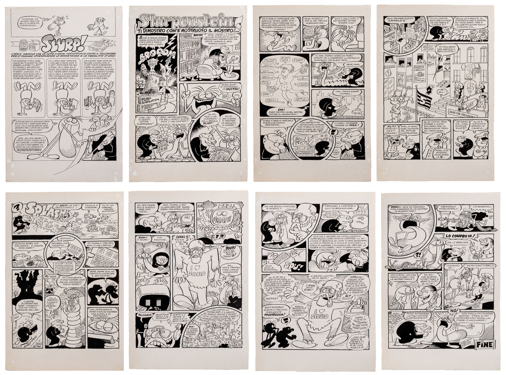 PEROGATT(1929 - 2011)Slurpenstein - Storia completa in 7 tavole e frontespizioChina su cartaOgni tavola misura 39,3 x 26,5 cm