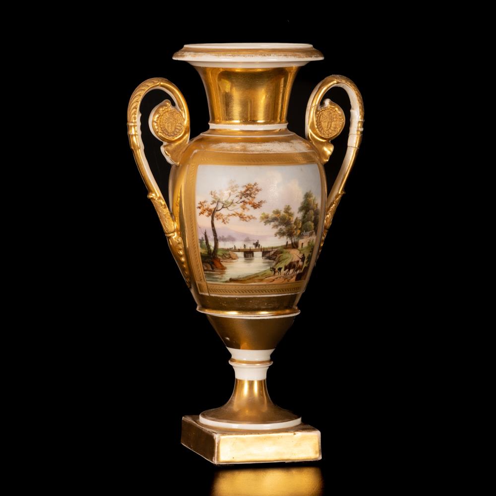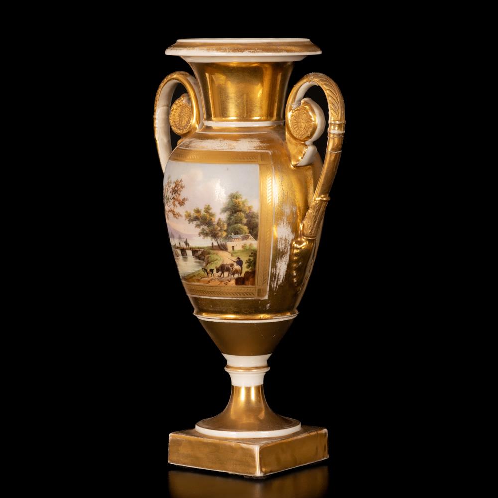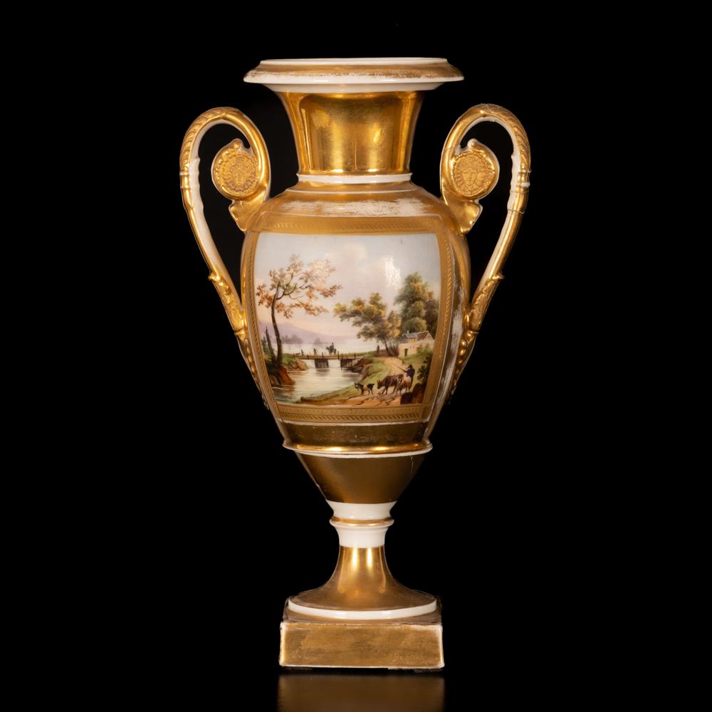 Lot 53 | Vaso biansato in porcellana a fondo oro e decoro policromo di paesaggio agreste entro riserva centrale al corpo ovoidale.