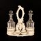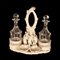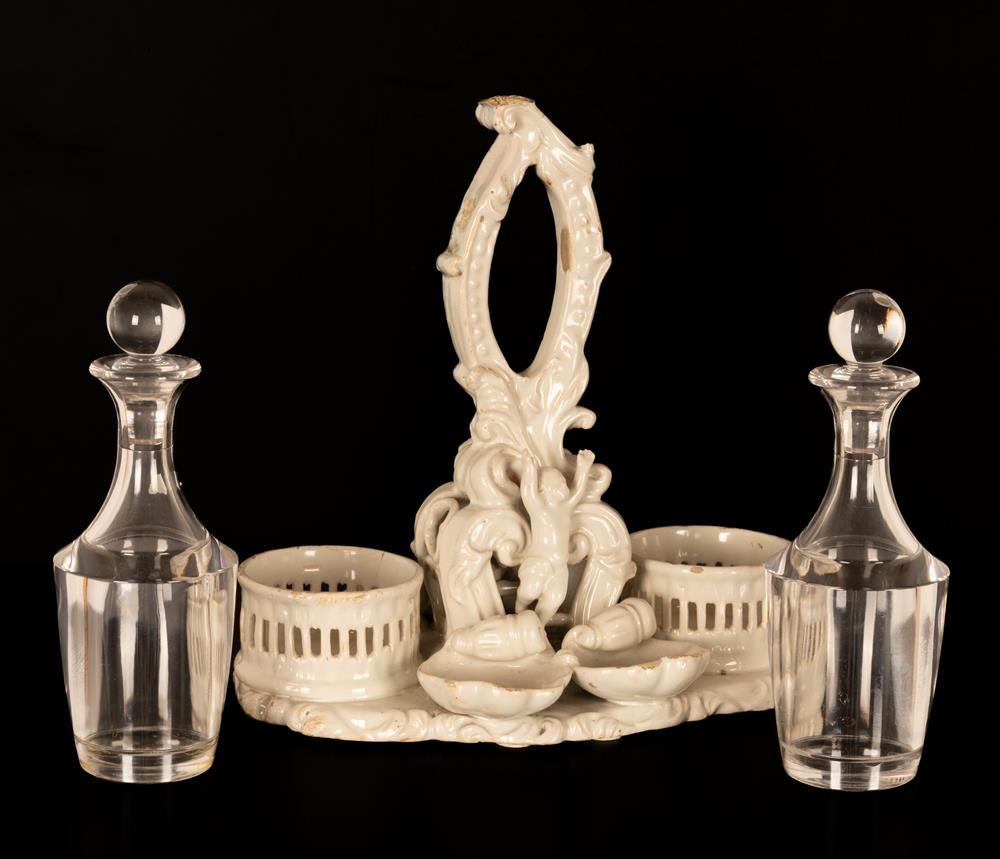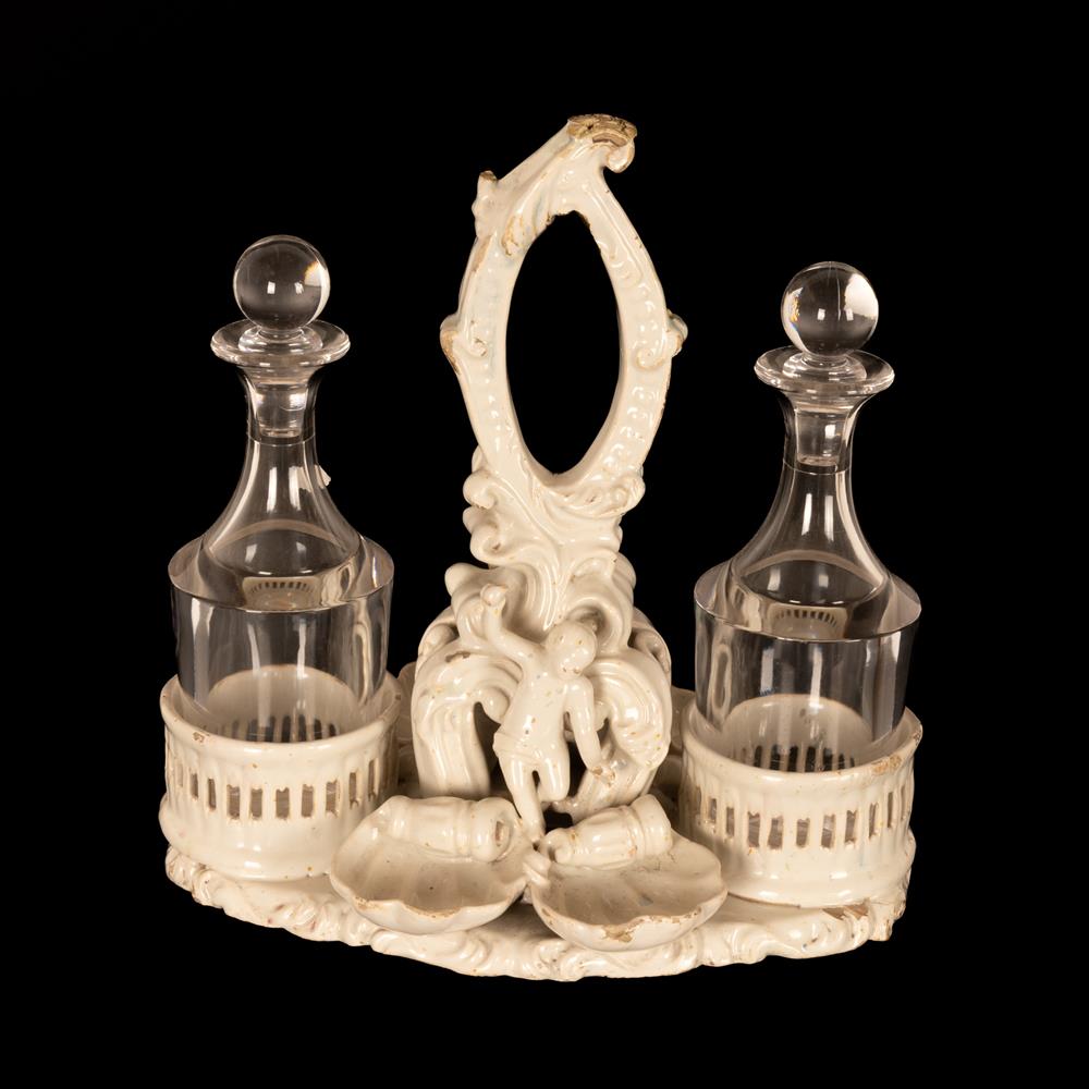 Oliera da tavola in terraglia bianca con decori a rilievo di gusto settecentesco.