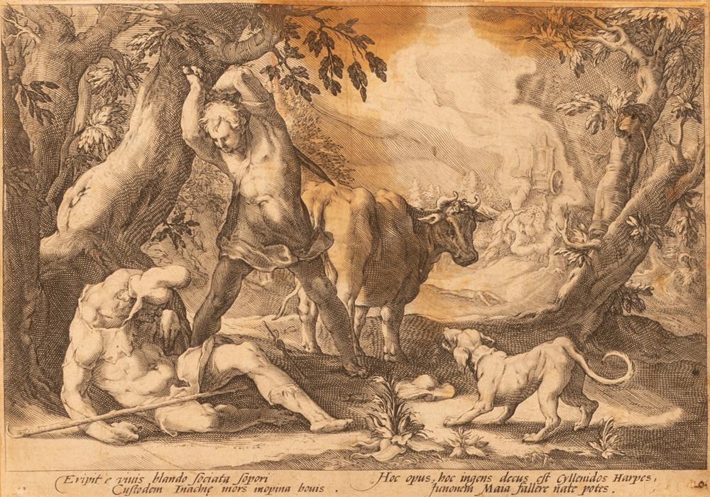 Una volta che Argo si è addormentato, Mercurio, dio di Cillene, come riferiscono Ovidio e Estius, smette di parlare e sfiora con la verga gli occhi di Argo. Goltzius non rappresenta questo momento, bensì il successivo, più violento, assassinio del pastore, decapitato con la spada ricurva del dio. Io è presente nella scena, anche se di spalle come fosse pronta all’imminente fuga, ma non pare avere un ruolo dominante, nonostante si percepisca lo sconcerto della giovenca, consapevole di essere la causa della morte di Argo.