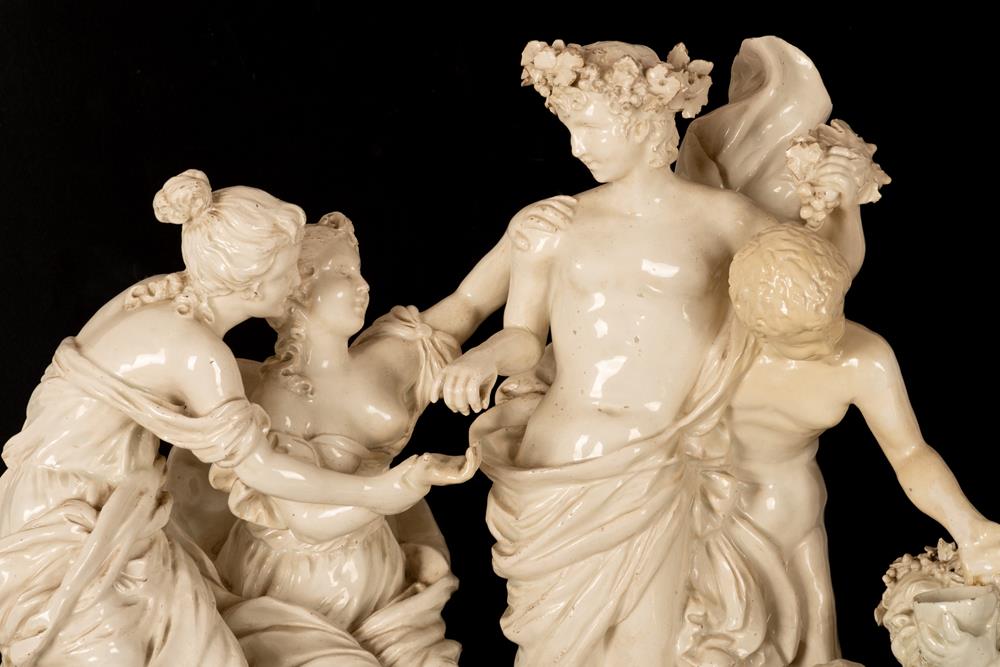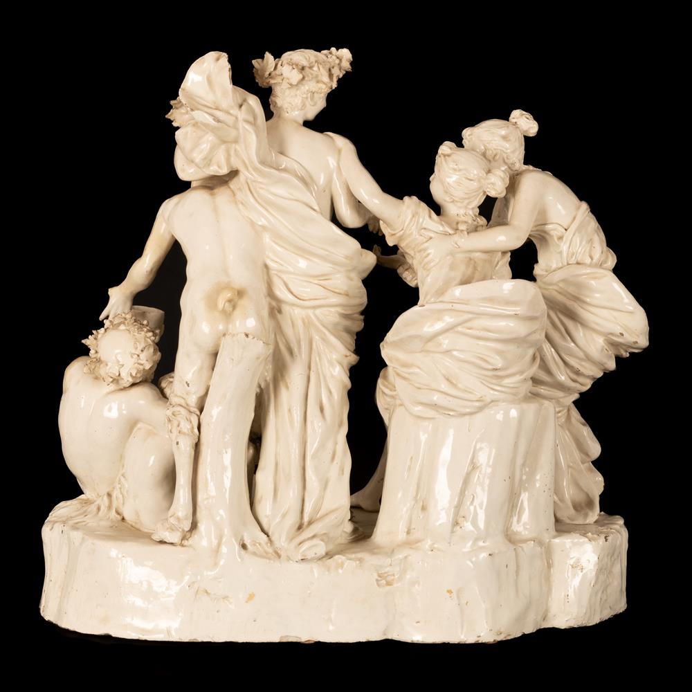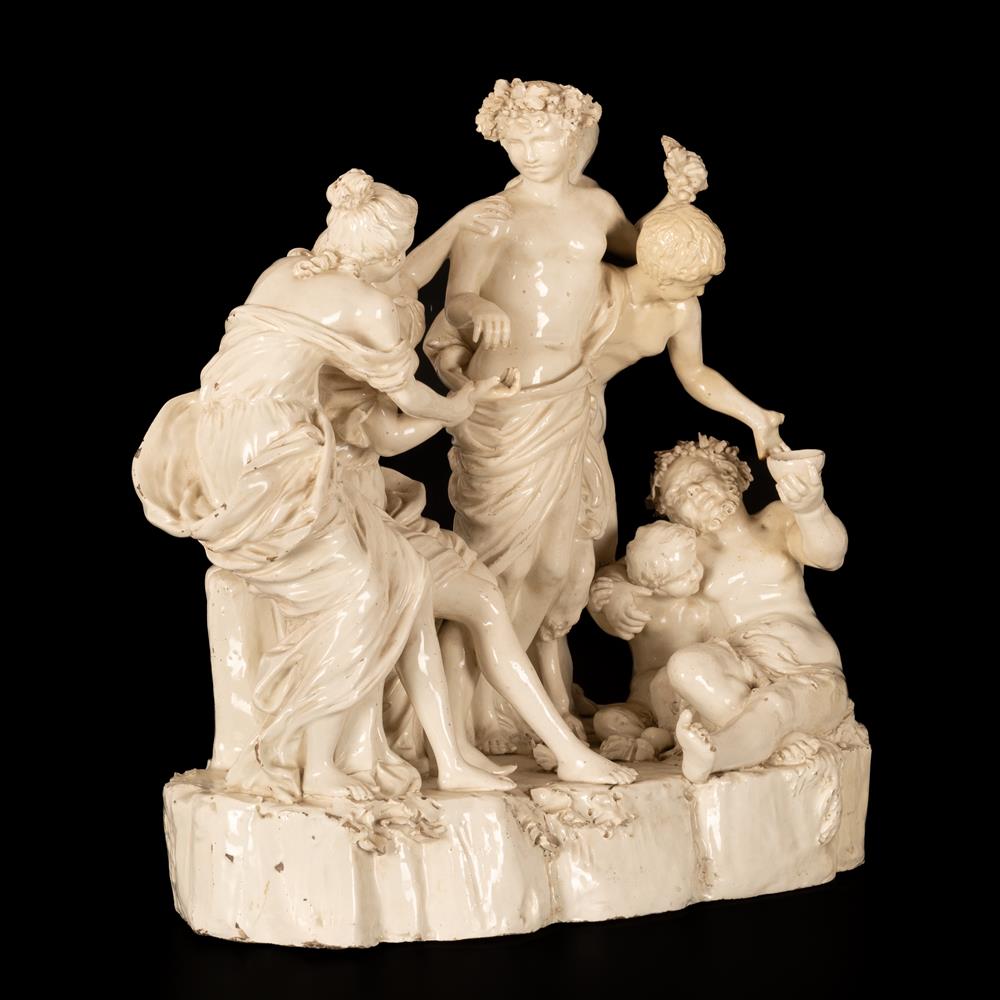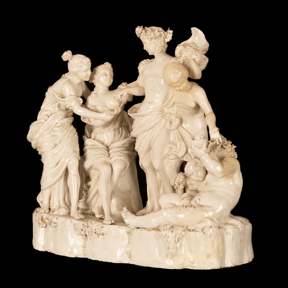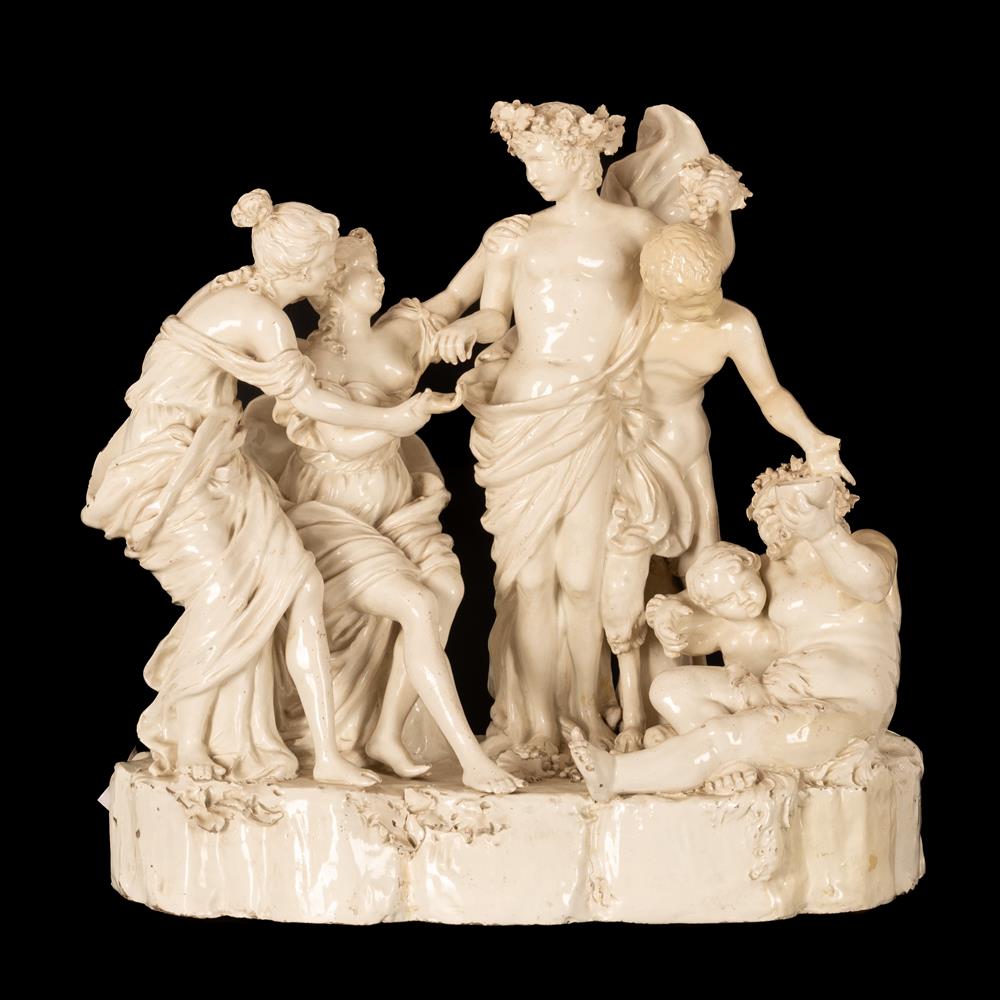 Gruppo scultoreo in terraglia raffigurante Bacco assistito dai satiri e da due menadi