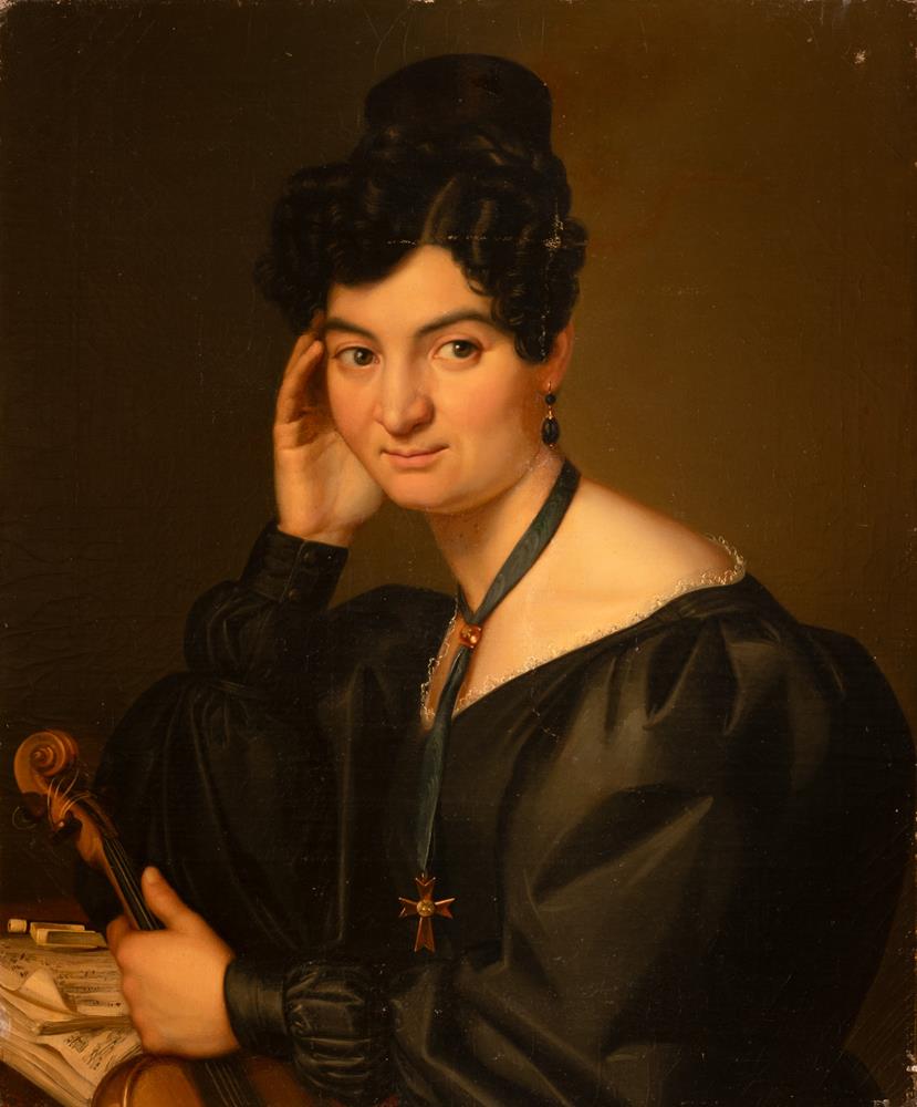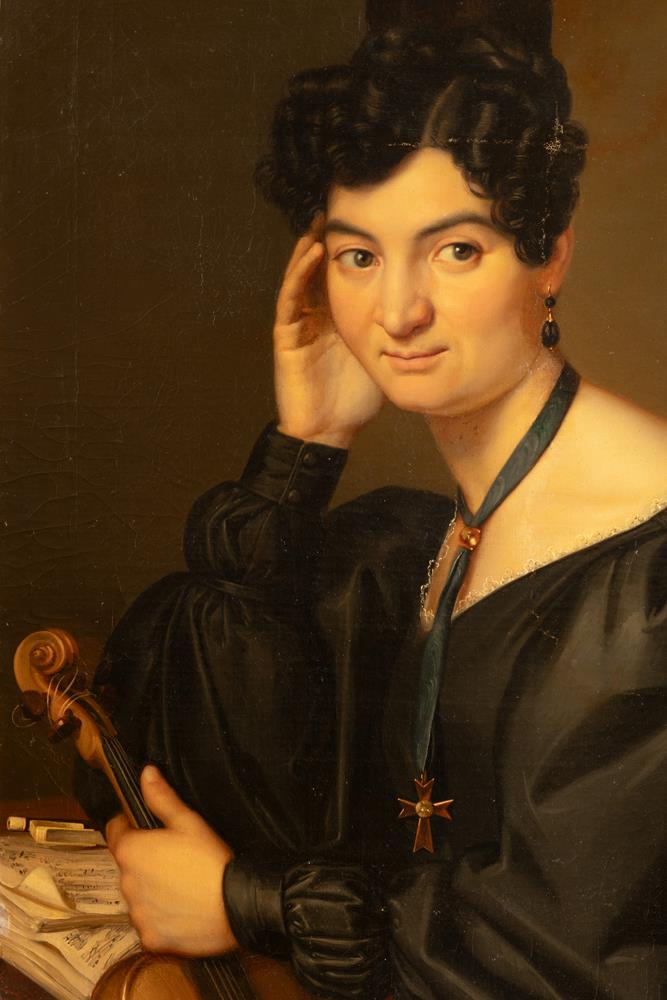 Ritratto di una giovane violinista. Pittore francese attivo tra il secondo ed il terzo decennio del XIX secolo.