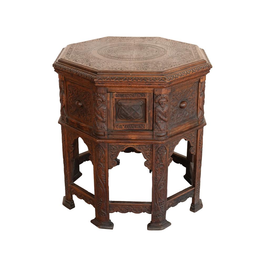 Tavolino ottagonale da caffè o da gioco in legno di rovere di origine anglo-indiano riccamente intagliato. Al piano inciso "Nicholas Corwen Knight and Dame Elizabethe" con stemmi araldici al centro inizi del XX secolo