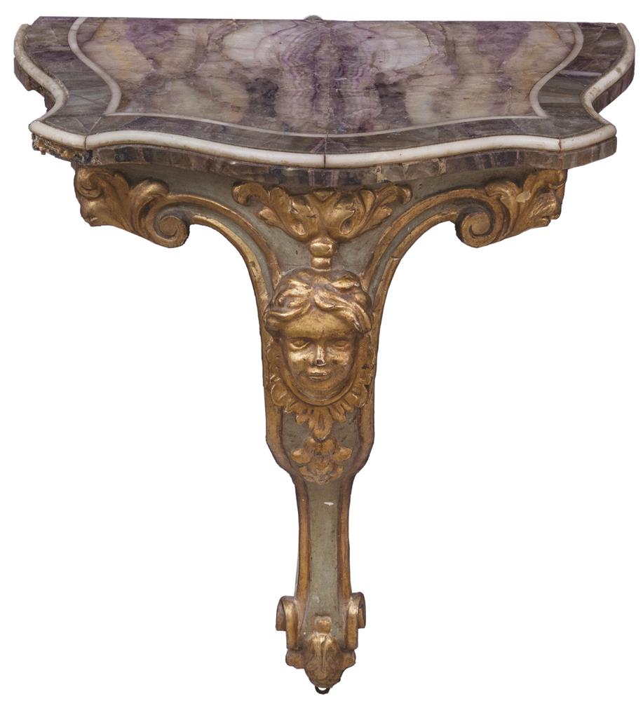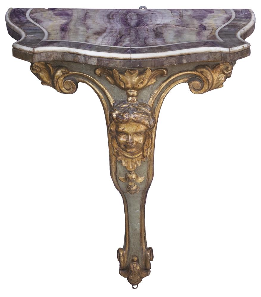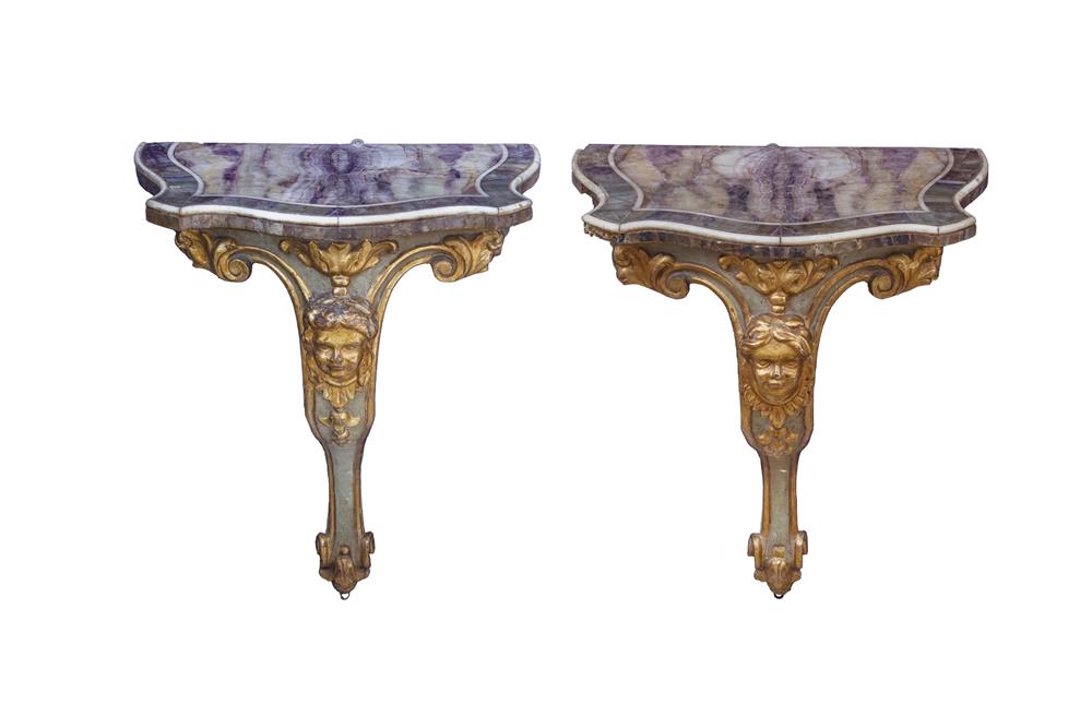 Coppia di consolle in stile eclettico intagliate, laccate e dotate con piano in marmo sagomato. Al fronte decoro con figure muliebri. Centro Italia, fine del XIX secolo