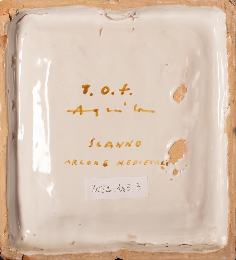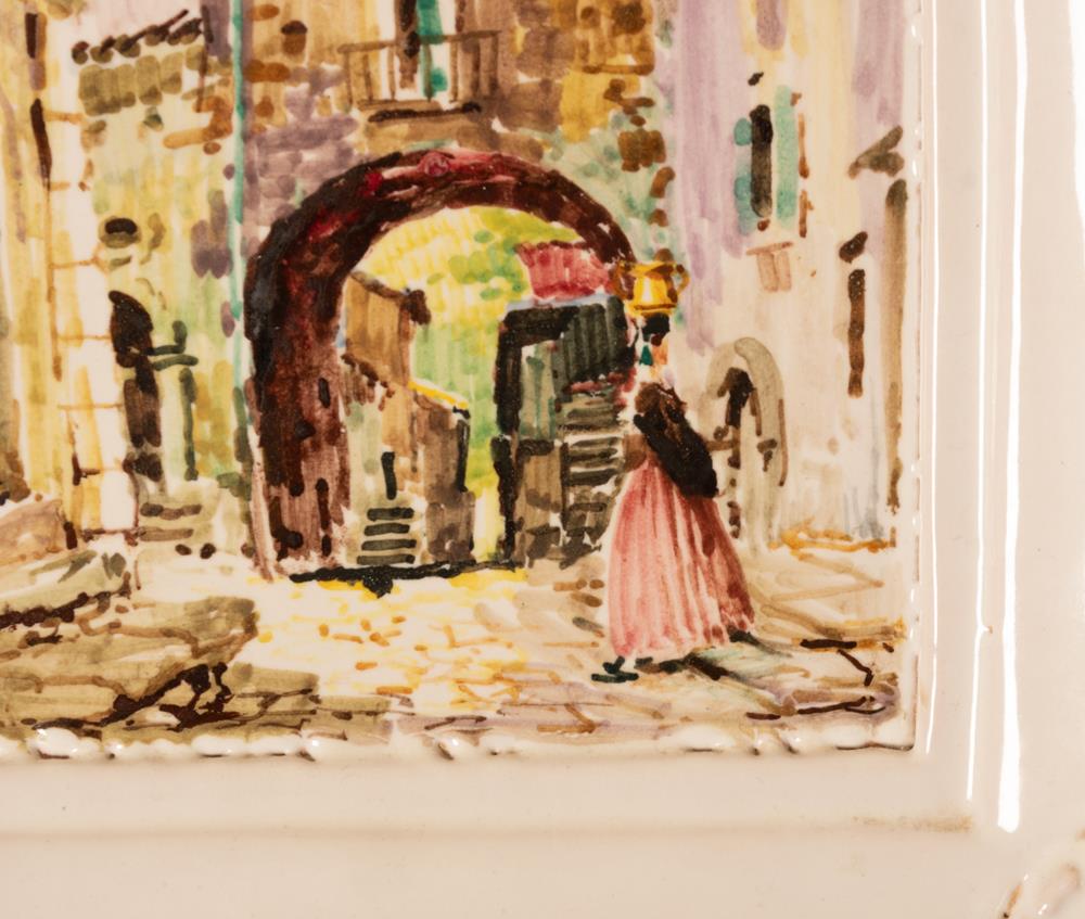 Mattonella e cornice in maiolica nei toni del bianco con istoriata una donna di Scanno in abiti tradizionali accanto al cd. "Arcone Medievale"