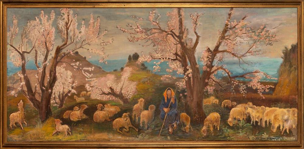 La pastora e il suo gregge tra alberi di pesco fiorito in riva al mare Tommaso Cascella
