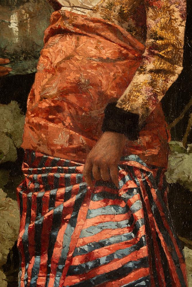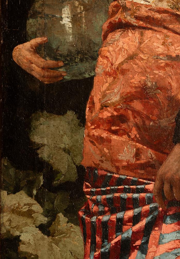 Anche in questo dipinto preso a paragone, come in quello proposto in asta, l'abito importante indossato stride con la semplicità del ramo che Donna Nunziata tiene sulle spalle e dal quale pende un vaso.
