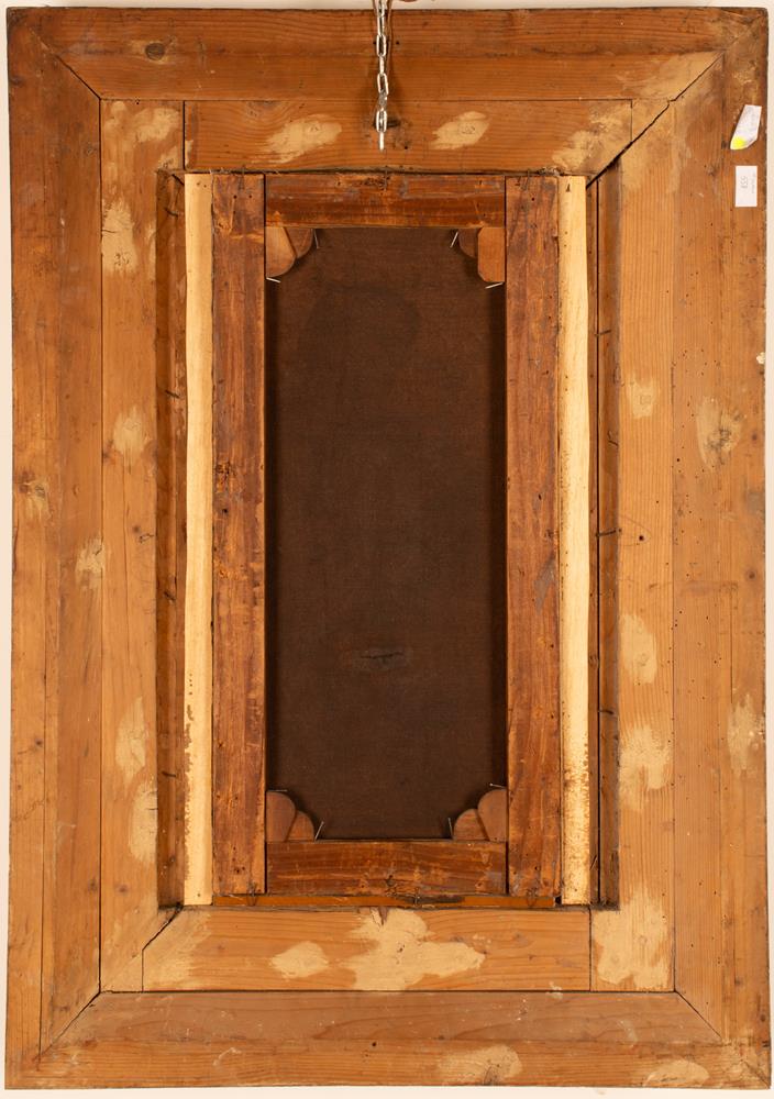 Cornice: dell'ultima decade del XIX secolo, dorata ed intagliata, a battuta liscia e più ordini di modanature con decoro a rilievo fitomorfo ripreso al centro dei quattro lati da un nastro annodato.