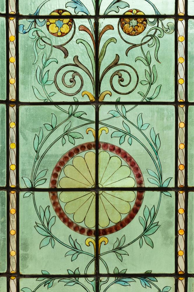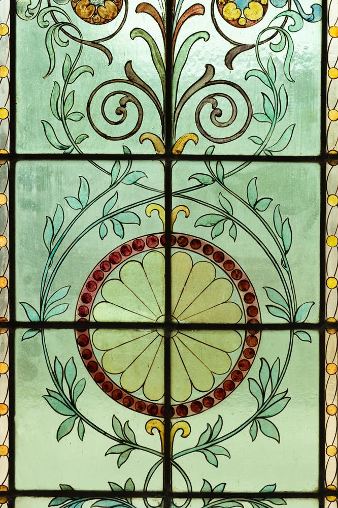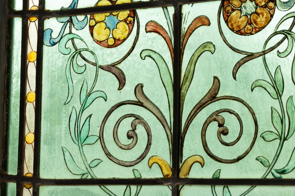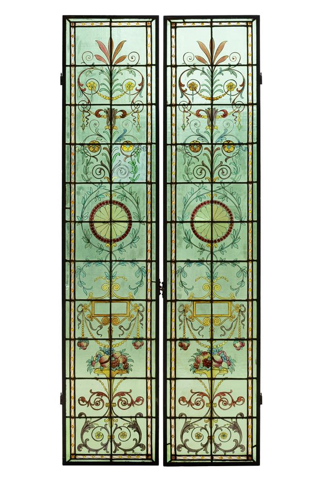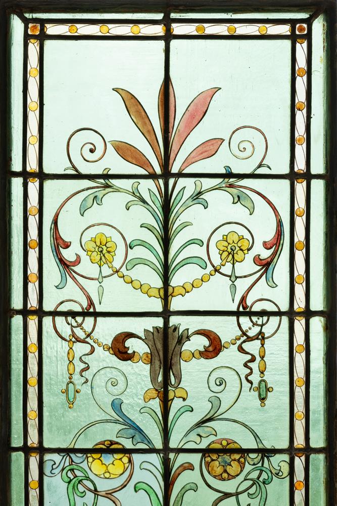 Coppia di vetrate liberty in vetro piombato e vetro piombato colorato. Italia fine XIX-inizio XX secolo.