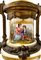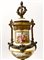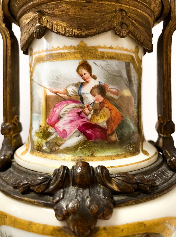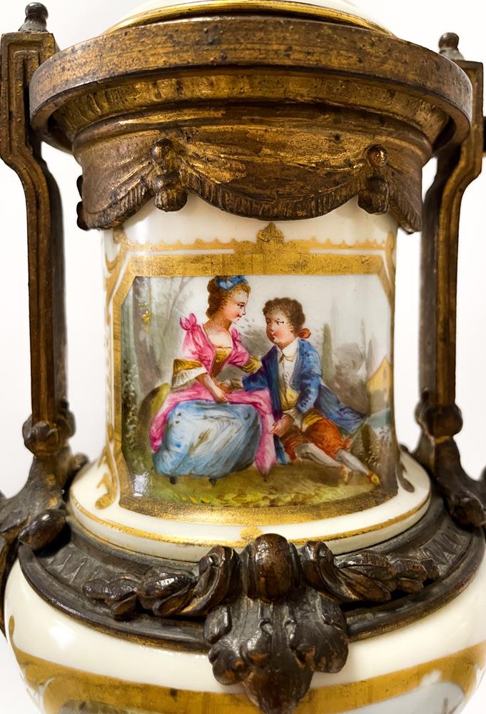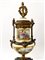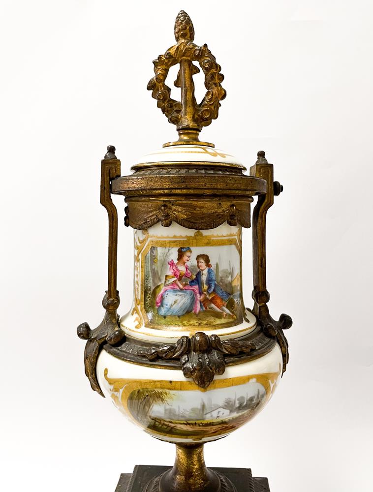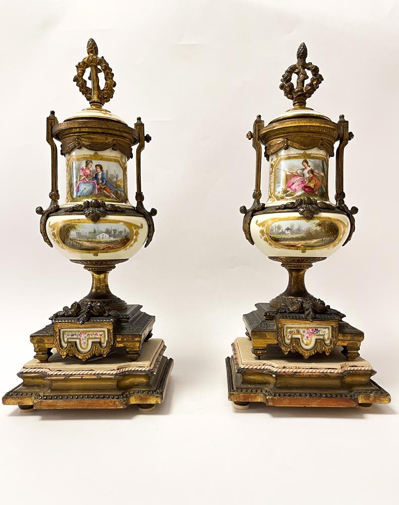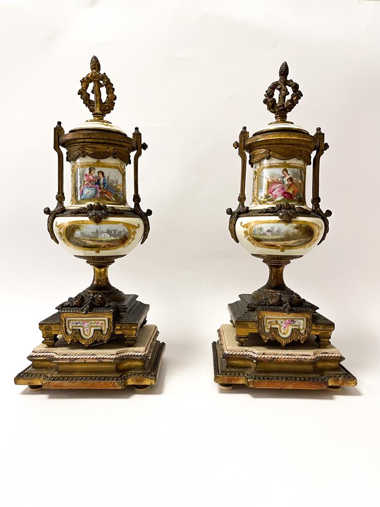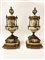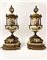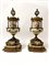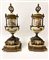 Set di due vasi in bronzo dorato finemente cesellato con inserti floreali. Corona d'alloro e pigna all'apice del coperchio
