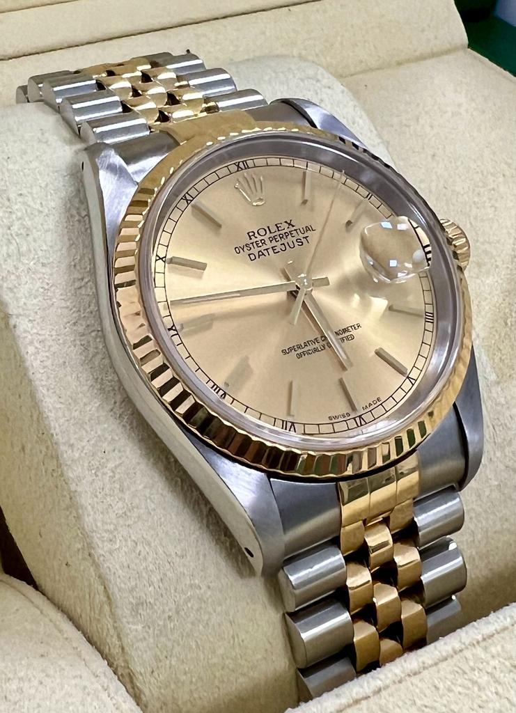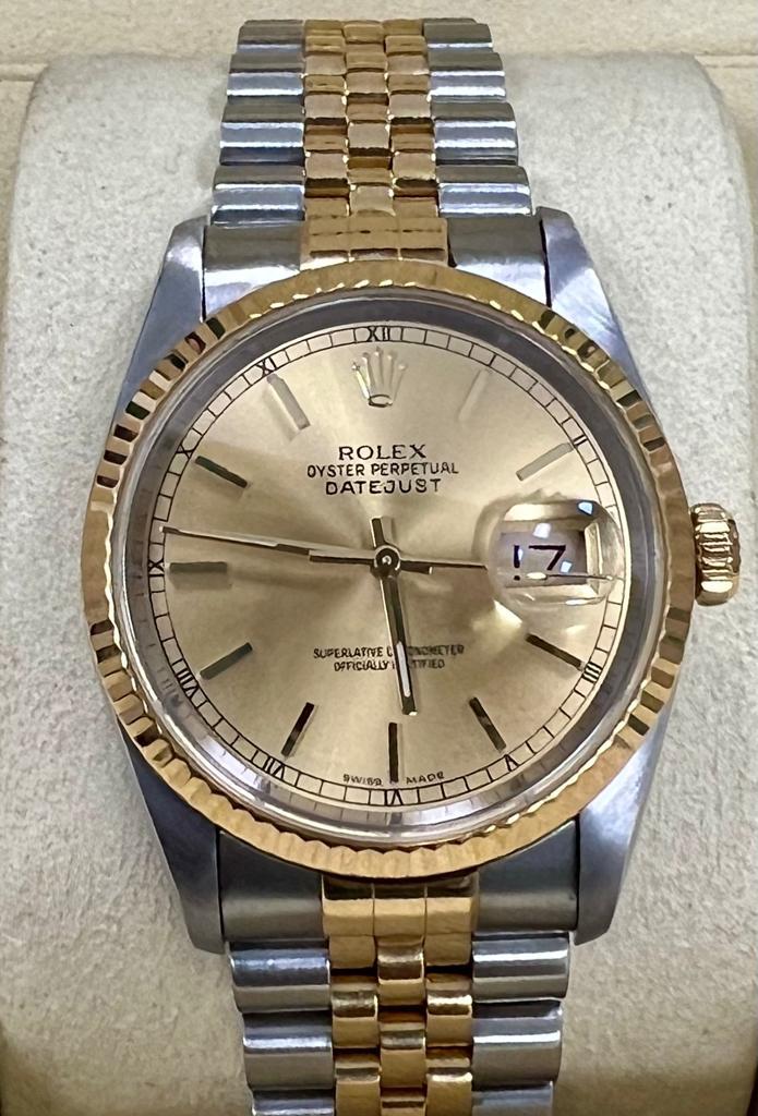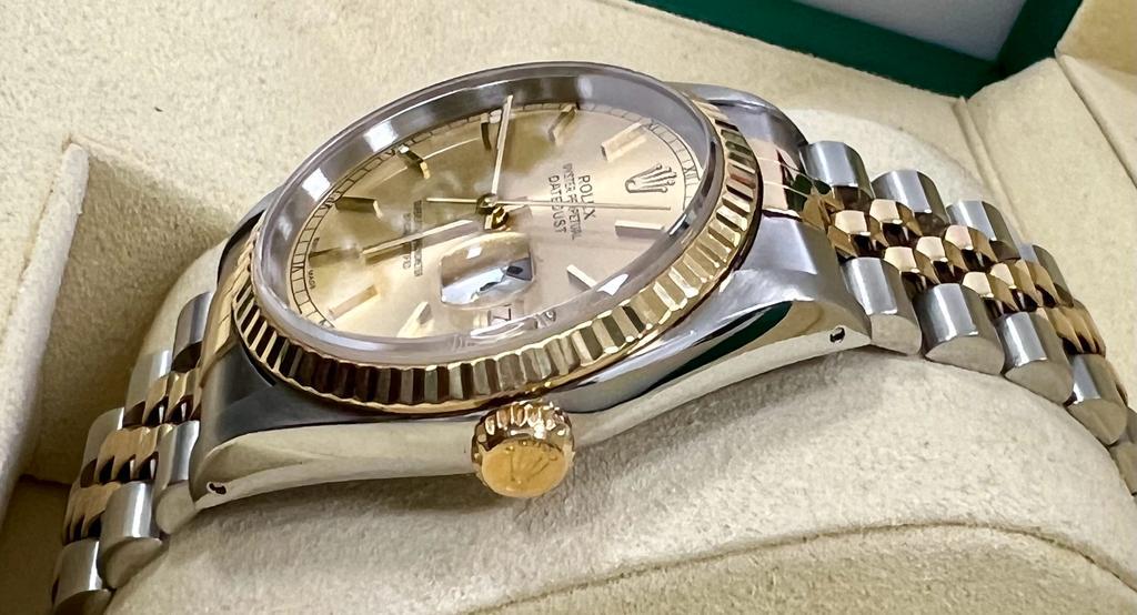 Marca Rolex Modello (Orologio) Datejust 36 Numero di referenza 16233 Carica Automatico Materiale della cassa Oro/Acciaio Materiale cinturino Oro/acciaio Anni 90 Condizione Usato (Ottimo) L'articolo presenta segni di usura lievi, come ad esempio graffi leggeri, ma non percepibili al tatto. Corredo Con documenti originali, no box la scatola utilizzata solo per fotografie non in vendita Diametro 36 mm Impermeabile 10 ATM Materiale lunetta Oro giallo Vetro Vetro zaffiro Cinturino Materiale cinturino Oro/acciaio Colore cinturino Oro/acciaio Chiusura Déployante Materiale chiusura Acciaio Funzioni Data