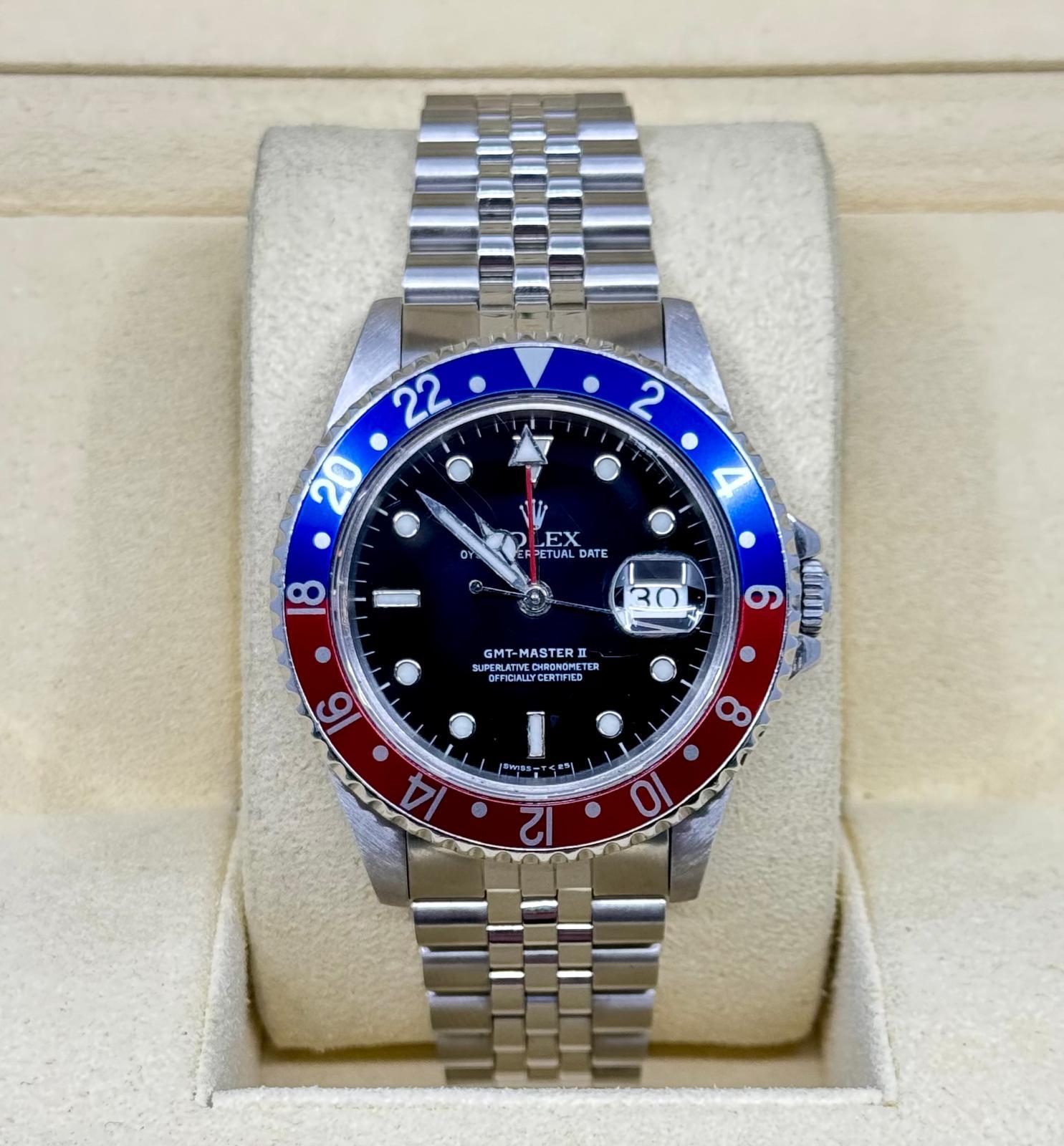Marca Rolex Modello (Orologio) GMT-Master II Numero di referenza 16710 Carica Automatico Materiale della cassa Acciaio Materiale cinturino Acciaio Condizione Usato L'articolo presenta segni di usura lievi, come ad esempio graffi leggeri, ma non percepibili al tatto. no documenti originali Rolex, no box la scatola utilizzata solo per fotografie non in vendita Carica Automatico anni 90 Materiale della cassa Acciaio Diametro 40 mm Impermeabile 10 ATM Materiale lunetta Acciaio Vetro Vetro zaffiro Quadrante Nero Numeri sul quadrante Senza numeri Cinturino Materiale cinturino Acciaio Colore cinturino Acciaio Chiusura Déployante Materiale chiusura Acciaio Funzioni Data, GMT