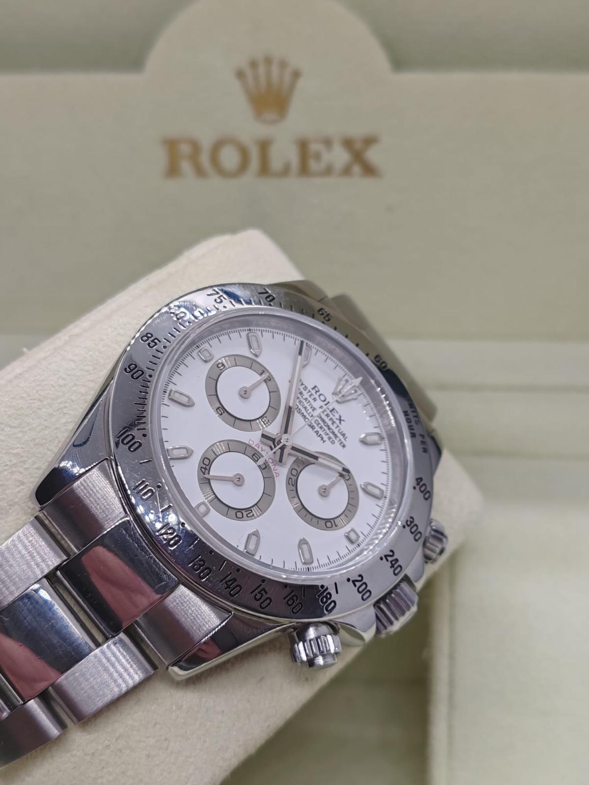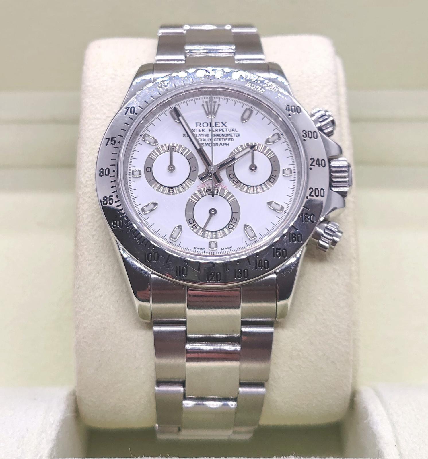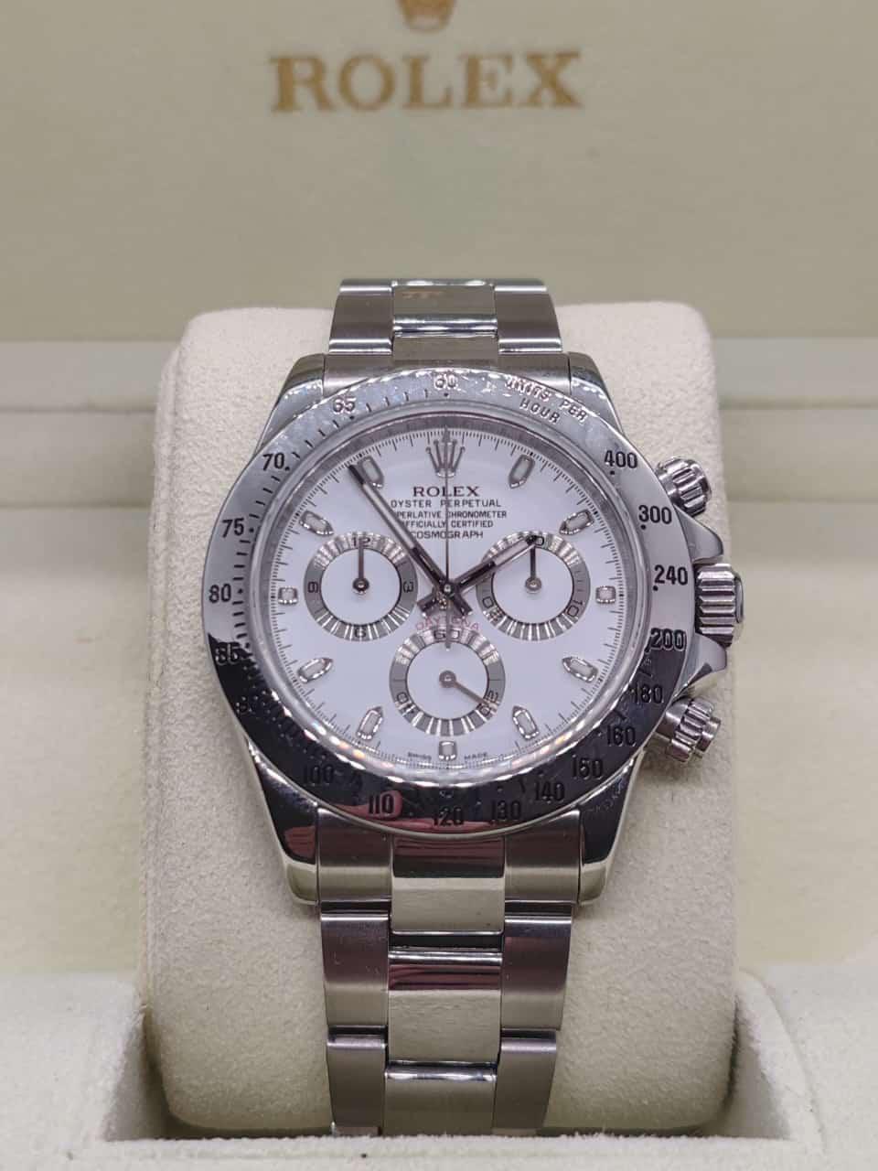 Marca Rolex Modello (Orologio) Daytona APH chromalight Numero di referenza 116520 Carica Automatico Materiale della cassa Acciaio Materiale cinturino Acciaio Anno di produzione 2014 Condizione Usato (Ottimo) documenti originali, no box Materiale della cassa Acciaio Diametro 40 mm Impermeabile 10 ATM Materiale lunetta Acciaio Vetro Vetro zaffiro Quadrante Bianco Numeri sul quadrante Senza numeri Cinturino Materiale cinturino Acciaio Colore cinturino Acciaio Chiusura Déployante Materiale chiusura Acciaio