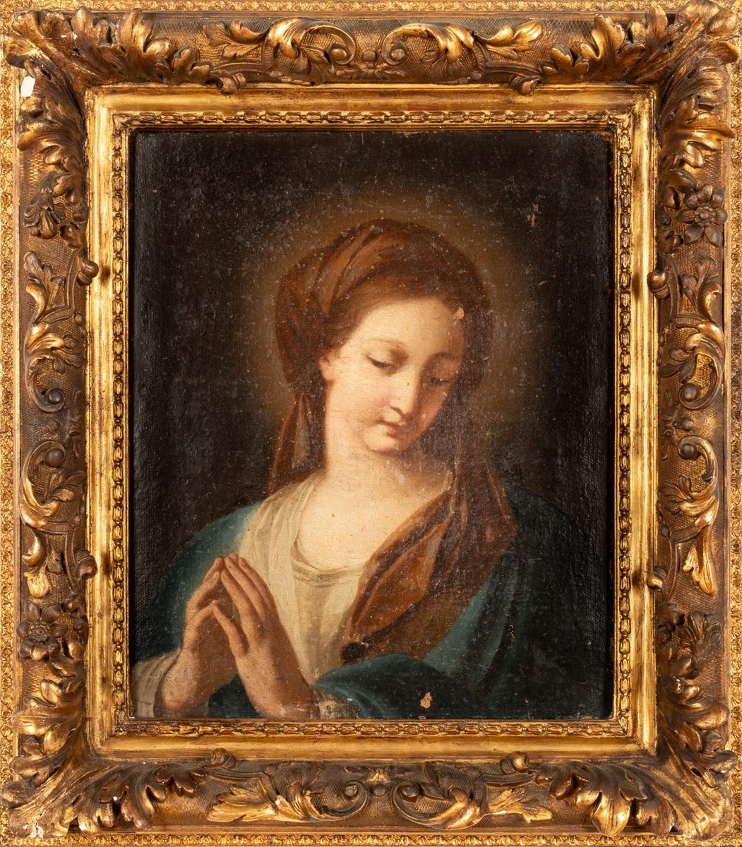 Madonna orante Cornice dorata con racemi, fiori e foglie d'acanto a riliev