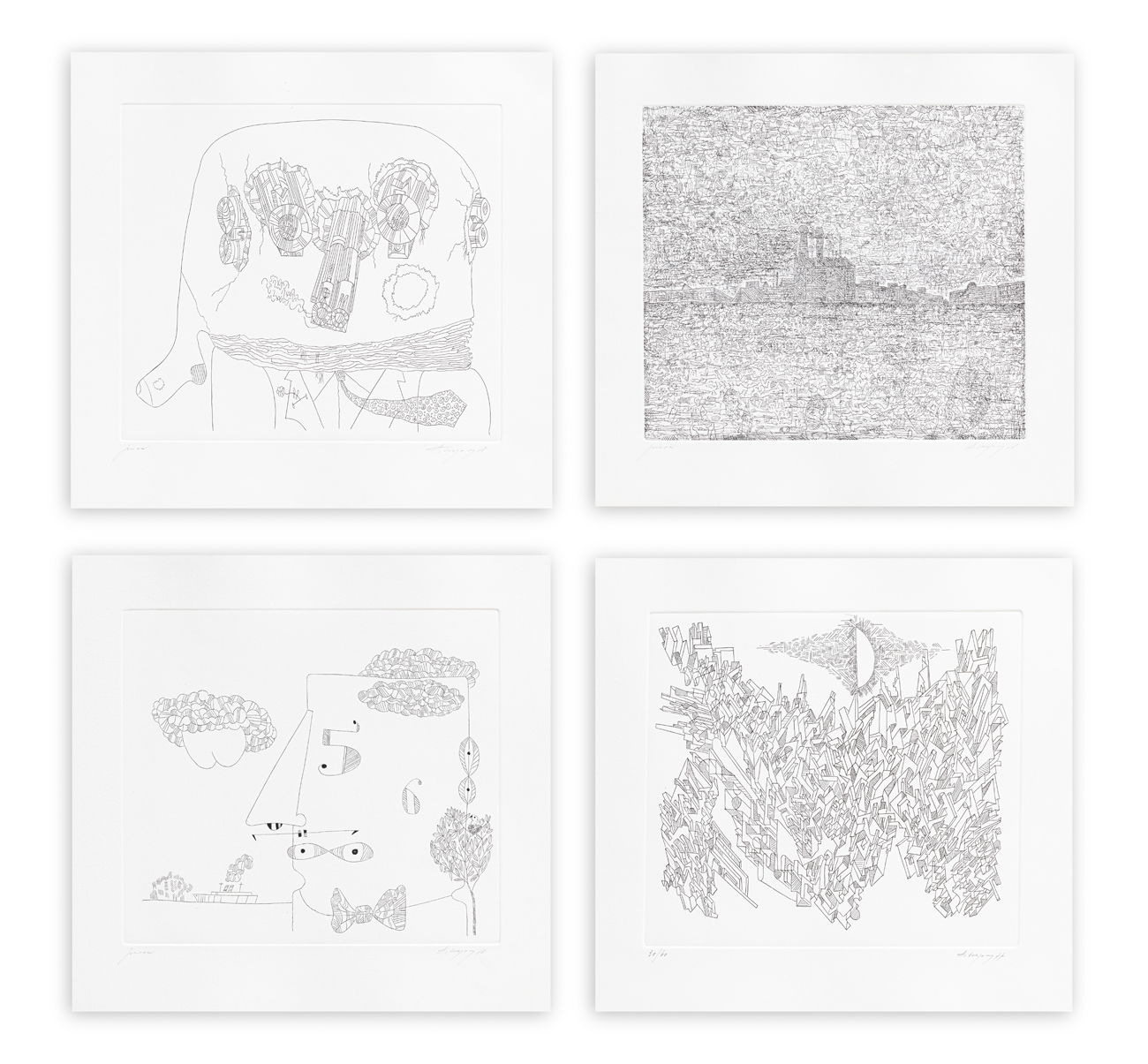 Lotto unico di 4 acqueforti di Alberto Longoni, ciascuna recante firma, datazione e numerazione a matita al fronte