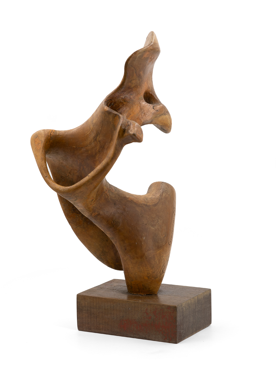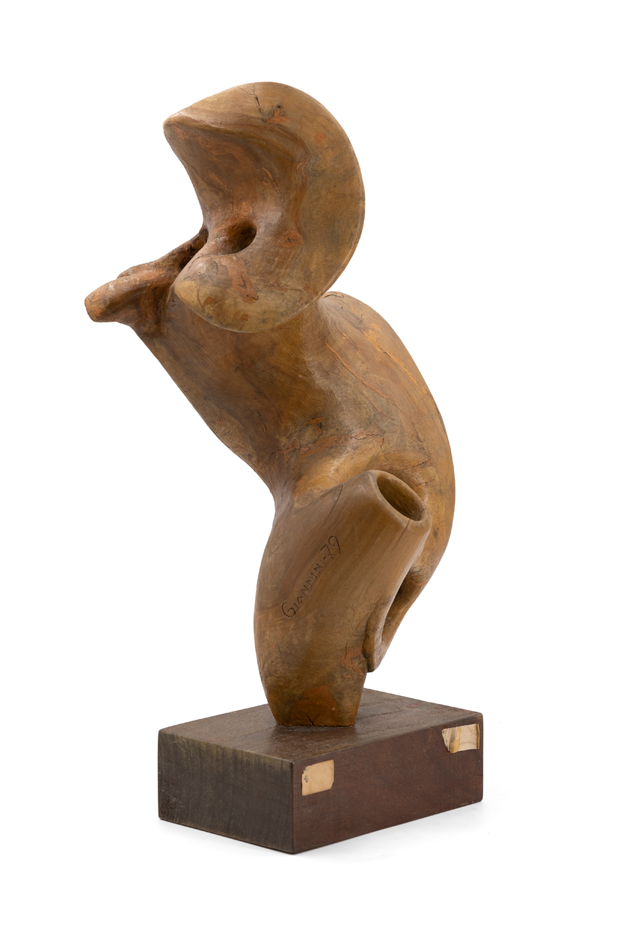Scultura in legno intagliato e sagomato poggiante su base in legno