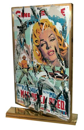 Rotella Mimmo Cinema (Marilyn" fronte e "Far West" retro), 2000 lastra in bronzo dorato (8 kg) con applicazioni serigrafiche, cm. 33x23x1 più base, es. 90/100 (la tiratura completa si compone di 100 es. + 10 prove d'autore + 20 in numeri romani) firmata in basso a destra, fotografia dell'autore che firma il pezzo nella stamperia del Sig. Serighelli, certificato di provenienza su foto dello stampatore "Arte 3 - Serighelli" Pieve Emanuele di Milano, opera registrata presso la Fondazione Mimmo Rotella di Milano, fotografia dell'opera in esposizione dalla Galleria Marconi di Milano alla mostra sui multipli d'artista del 2014