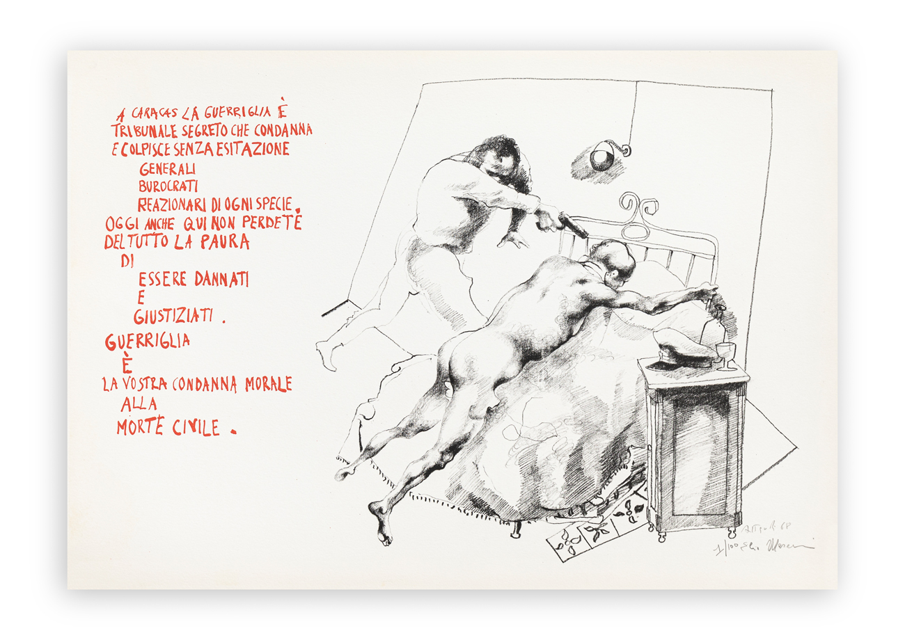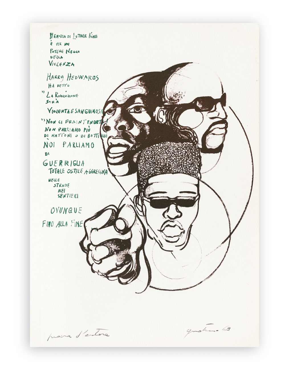 Cartella contenente testo di presentazione di Elio Mercuri e 4 litografie di Ugo Attardi, Ennio Calabria, Carlo Quattrucci e Renzo Vespignani, ciascuna recante firma, datazione (1968) e numerazione (Esemplari 1/100 (1); Prova d'Artista (3)) a matita al fronte