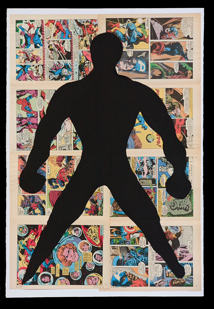 Canevari Paolo Supereroe, 2000 cartella contenente multiplo a colori realizzato incollando pagine originali di fumetti e successivamente inchiostrando con la tecnica del pochoir una figura nera, cm. 70x50, es. 84/99 firmato in basso al centro, opera edita da Tema Celeste Edizioni eseguita presso la tipografia Bulla di Roma senza cornice