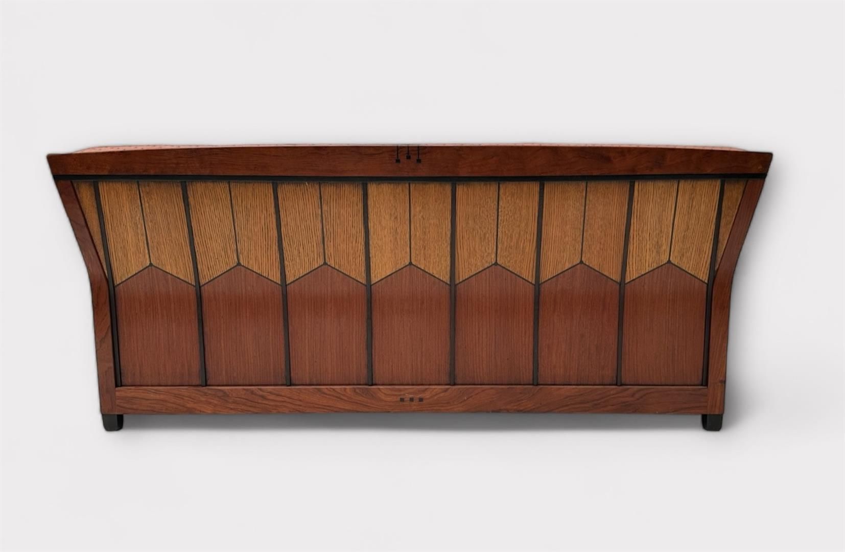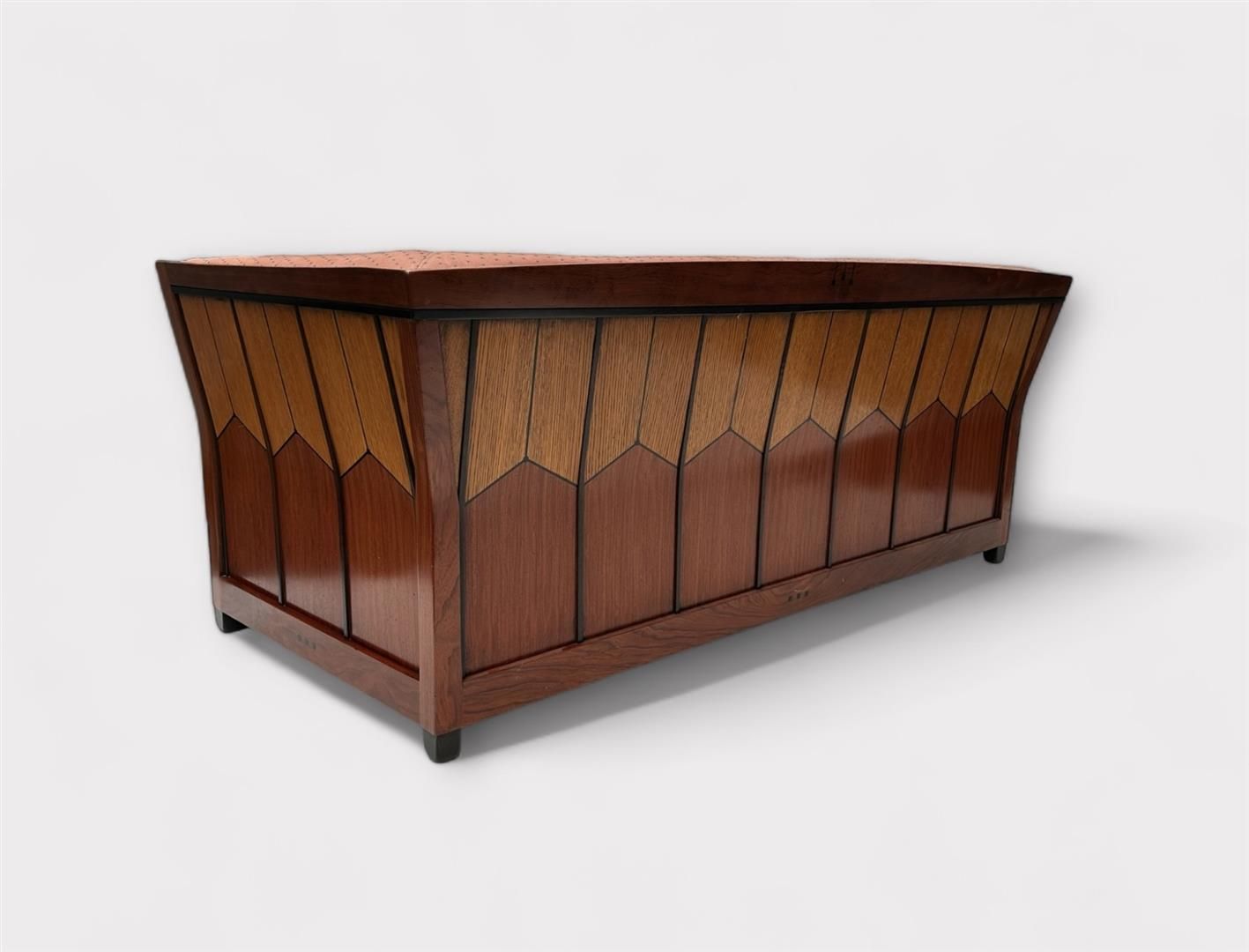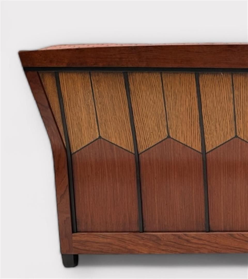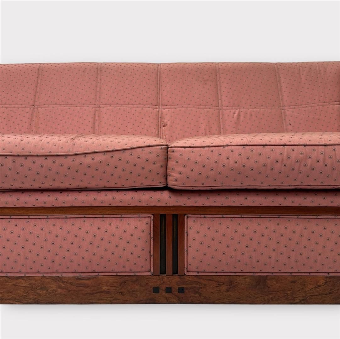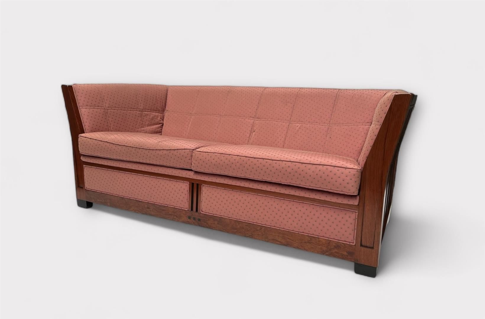 An Art Deco style Schuitema Decofarma 2.5 seater sofa model Lawrence made of various types of wood including rosewood or bubinga, with ebony and aluminium details. Beautifully crafted back with inlay. Upholstered in red fabric: 'Presto'. Total width: 184 x total depth: 80 x total height 74 cm. Seat height: 45 x seat depth 55 cm. Numbered '930'.