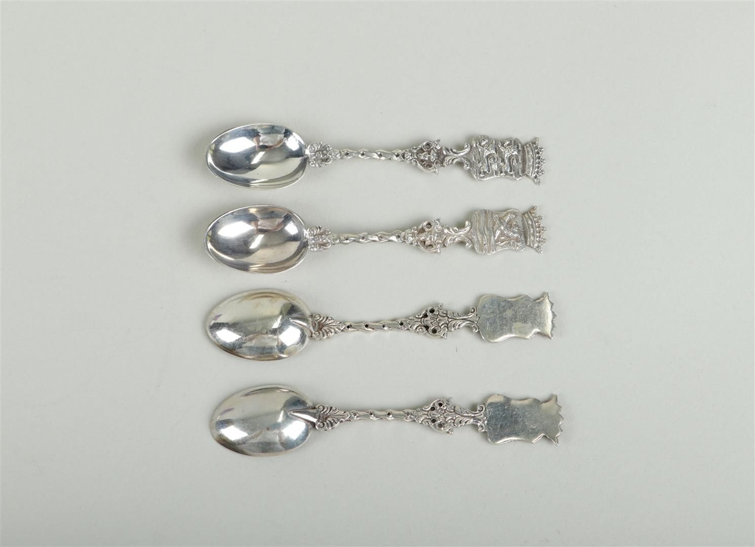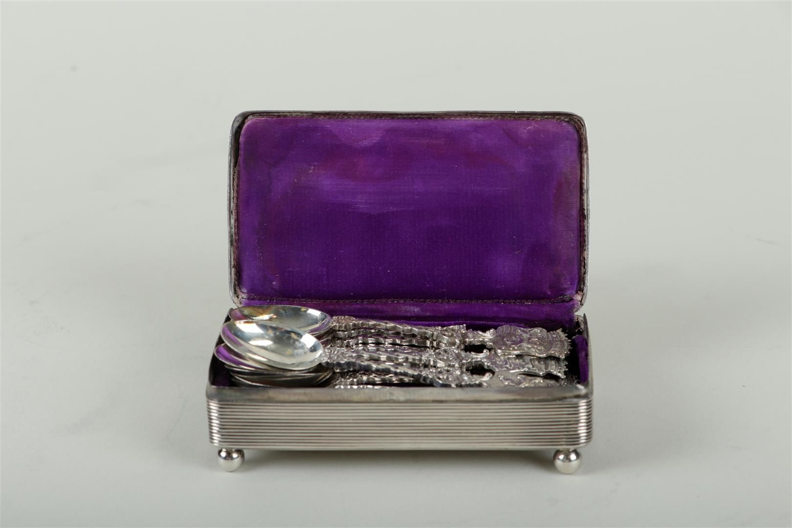 A silver tobacco box, converted into a spoon box, containing (12) provincial spoons. Total weight: 308 grams.