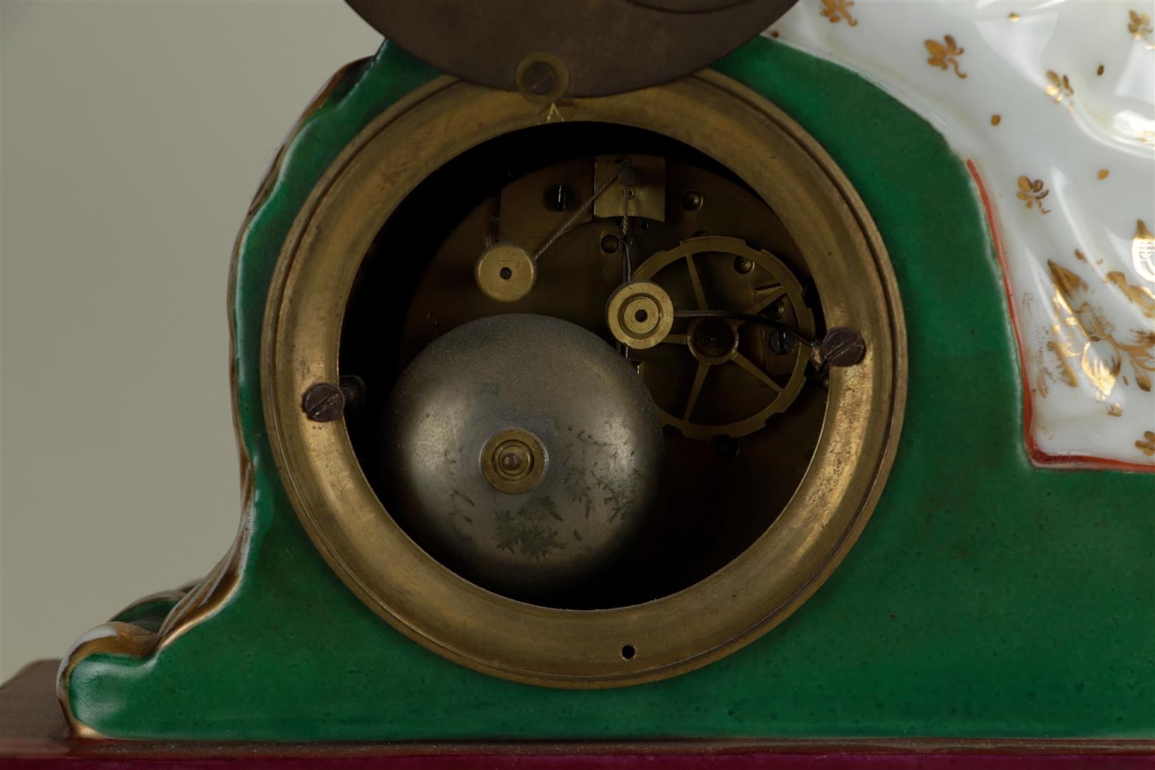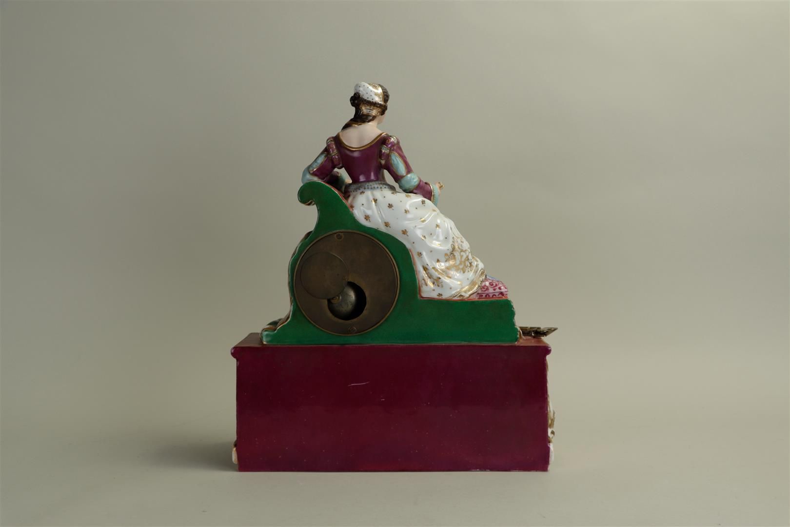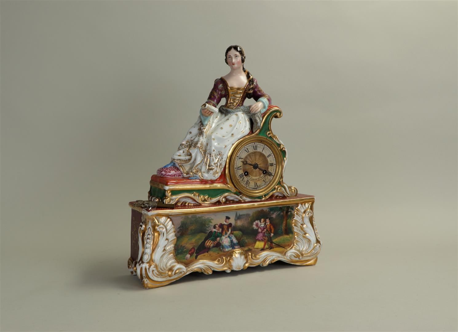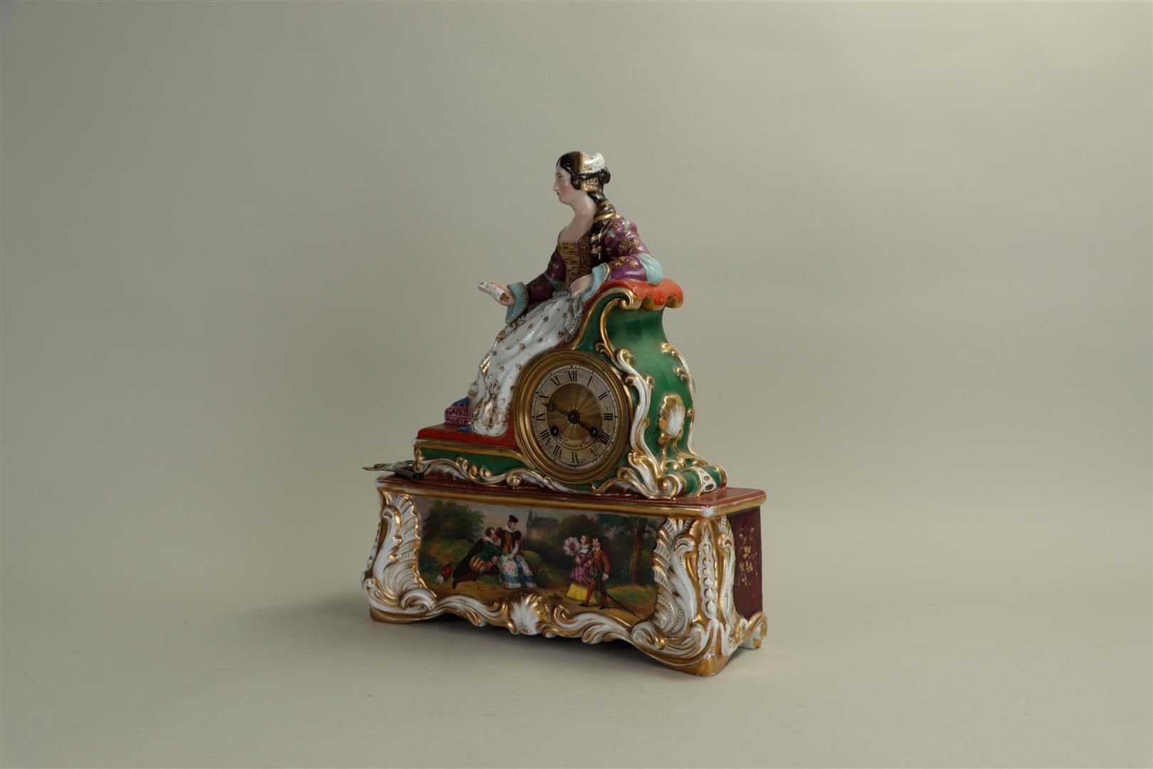 A porcelain mantel clock depicting a seated lady and a classical scene of two couples on the underside, string clockwork. Jacob Petit, France, circa 1850.