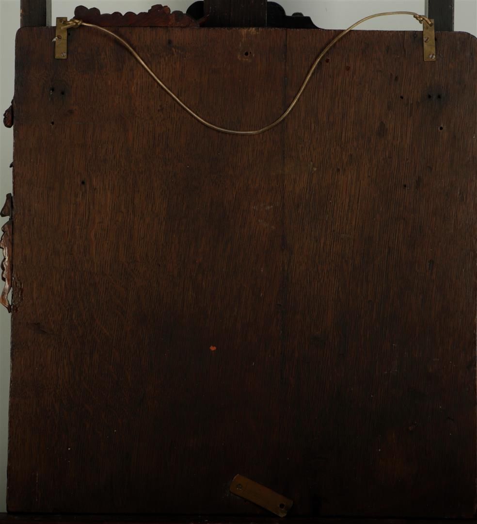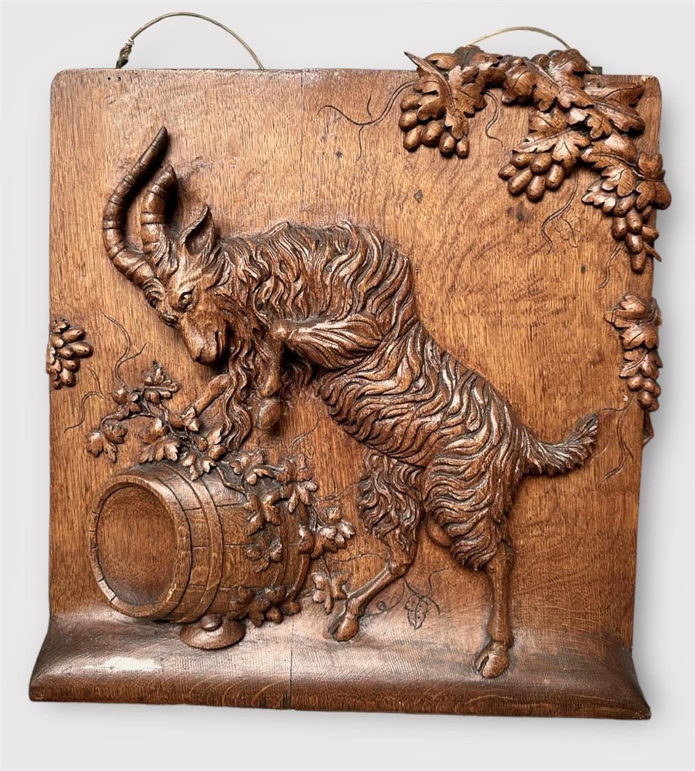 A wooden panel depicting a Goat with Wine Barrels and Grape Vines. France, 19th century. Some damage.
