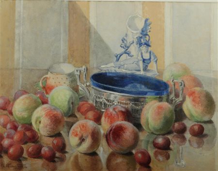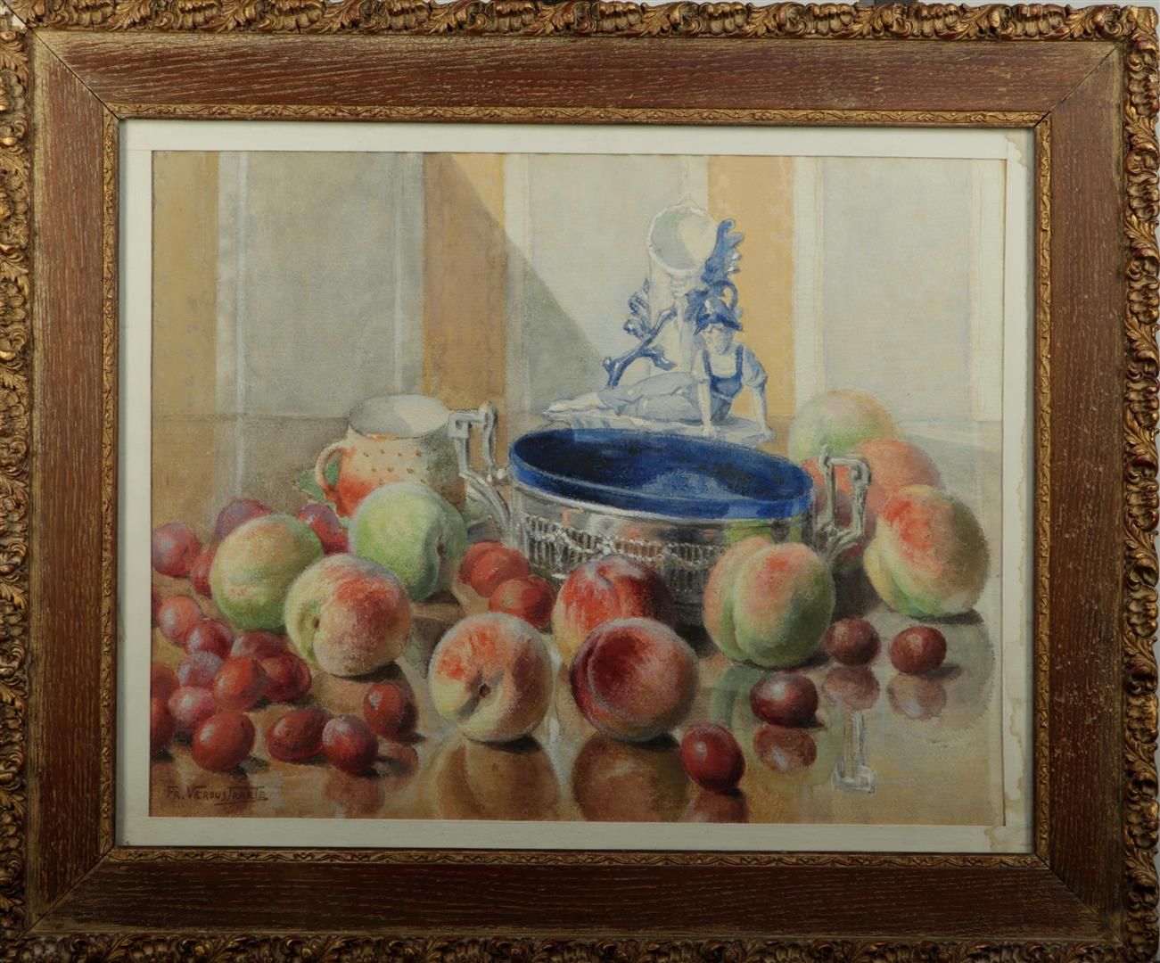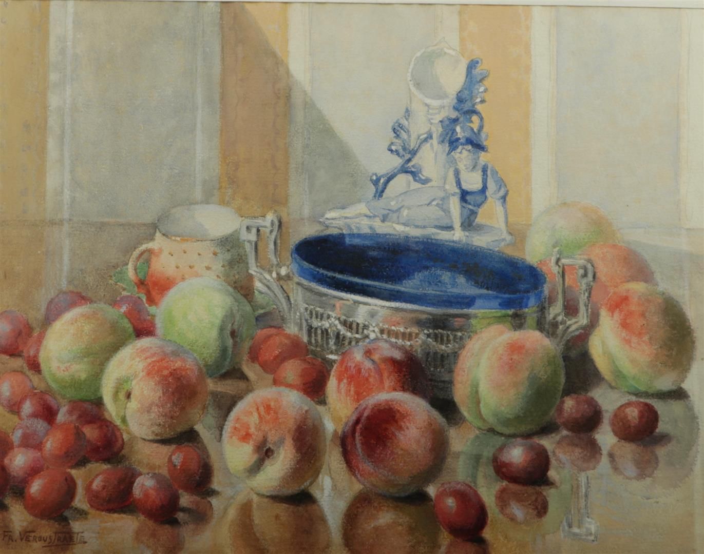 FrancoisVeroustraete (Belgium 1858-1930), Still Life with Piece de Millieu, signed (lower right), watercolor on paper.