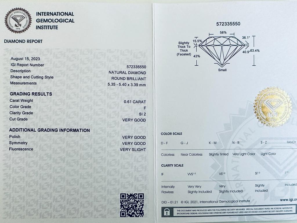 DIAMANTE 0,61 CARATI COLORE F - PUREZZA SI2 - TAGLIO BRILLANTE - CERTIFICATO IGI - PUREZZA SF30811