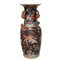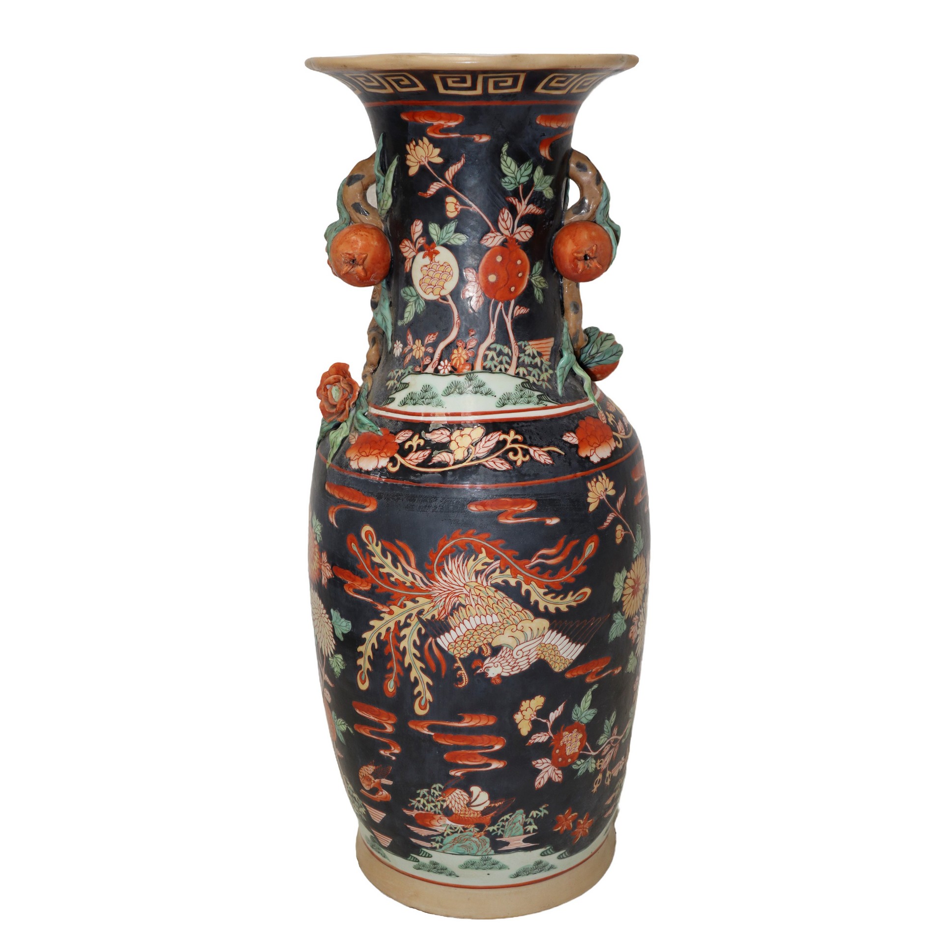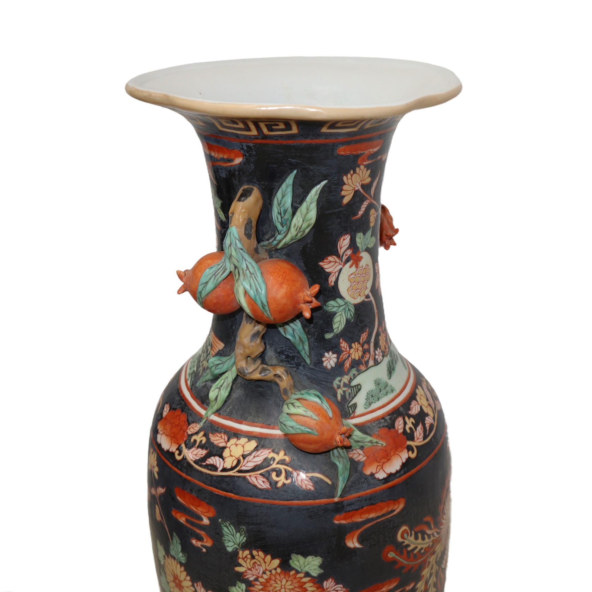 Grande vaso in porcellana fondo nero con decorazioni di frutta e fiori H cm 62x27 bocca cm 23 Manici con presa a guisa di melograni.Manici con presa a guisa di melograni.