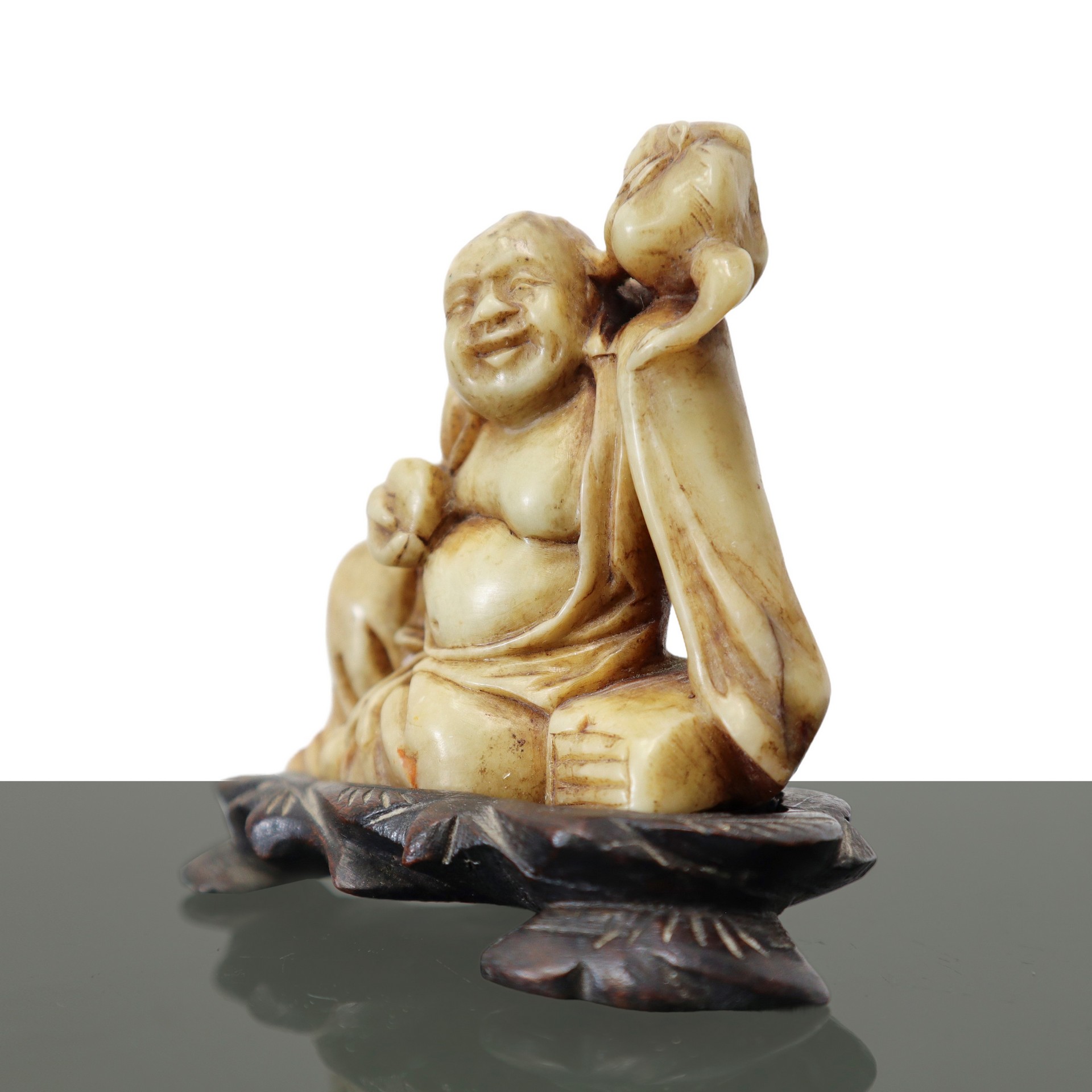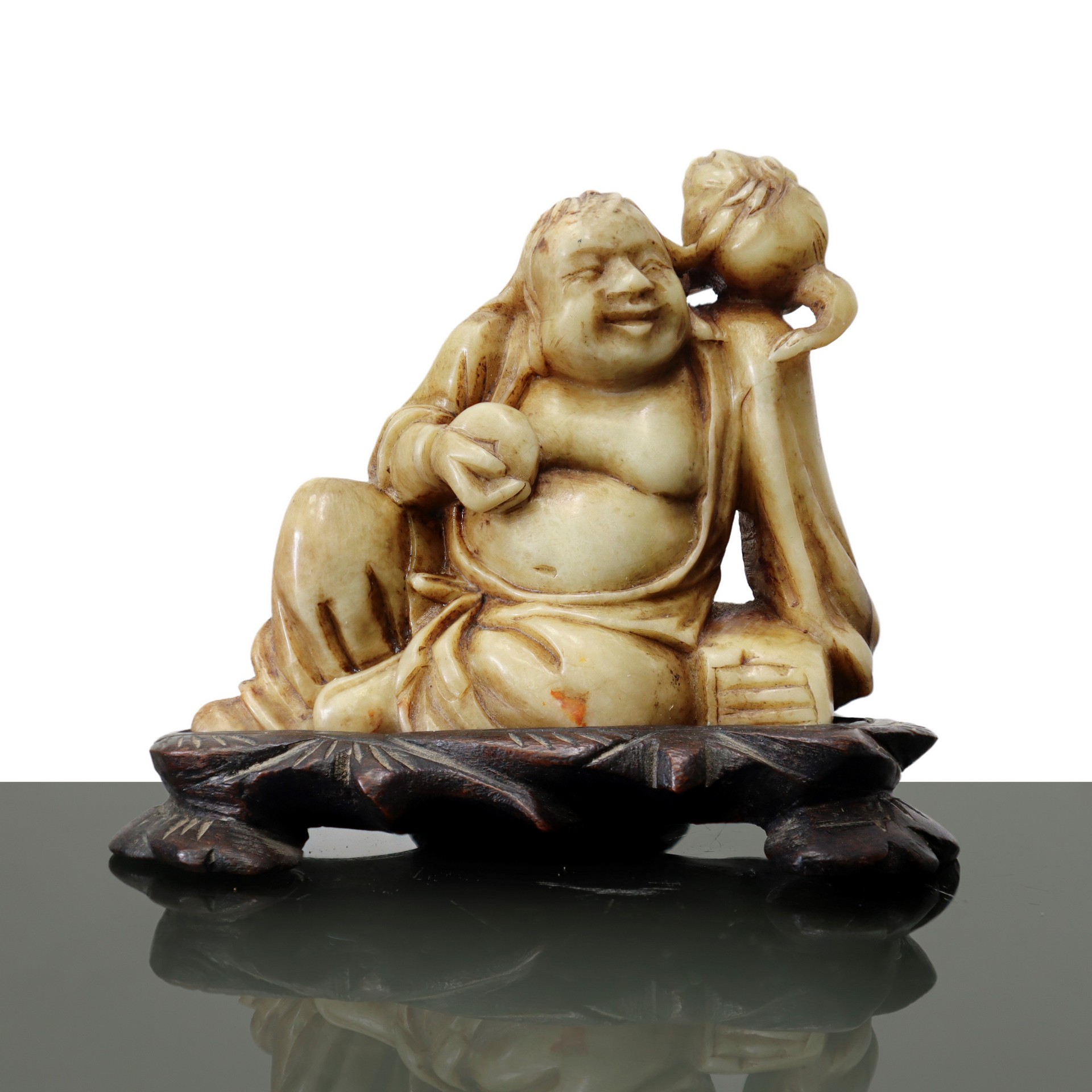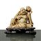 Buddha che ride in marmo H cm 7.5x9 - con base H cm 9x10 Scultura di Buddha sorridente in marmo con animale sulla spalla sinistra. Incisione di caratteri orientali alla base. Base in legno.Scultura di Buddha sorridente in marmo con animale sulla spalla sinistra. Incisione di caratteri orientali alla base. Base in legno.