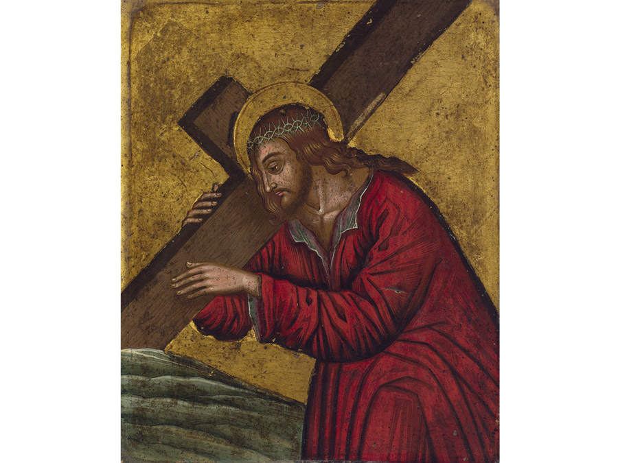 Scuola veneto cretese (XVIII secolo) Cristo Portacroce Olio su tavola, fondo oro Misure 28x23 cm