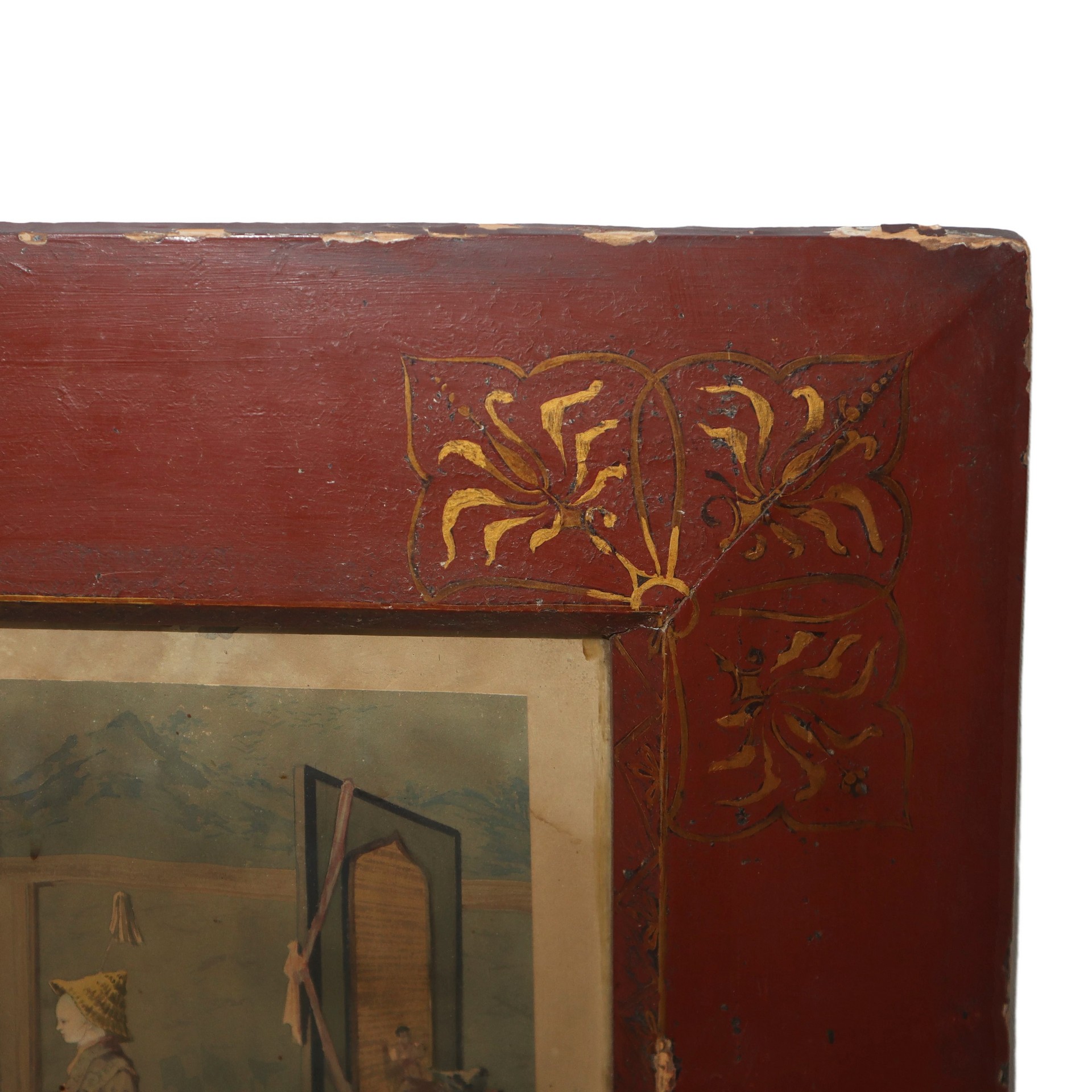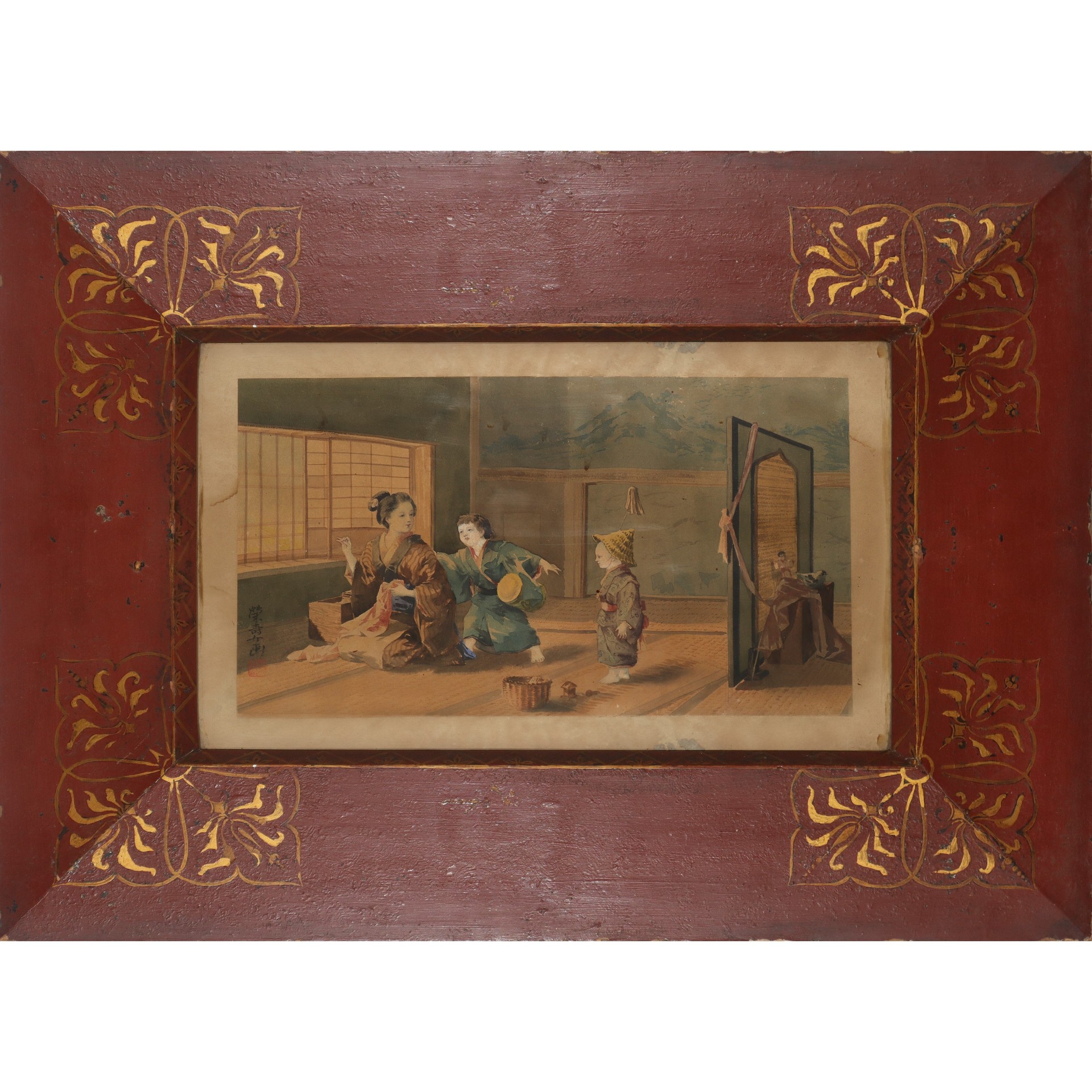 Scena di vita familiare, Japan, fine 19° secolo H cm 31x47 - in cornice H cm 55x70 Acquarello su carta Scuola giapponese. Firmato in basso a sinistra, entro cornice amaranto laccata e decorata.