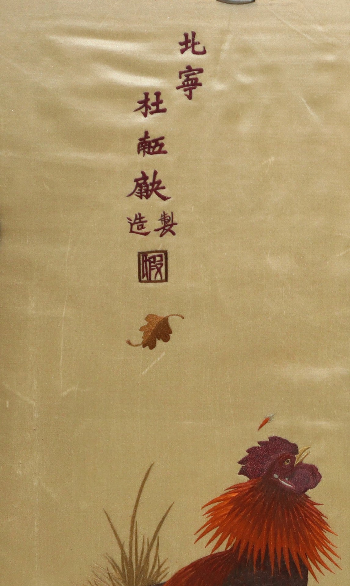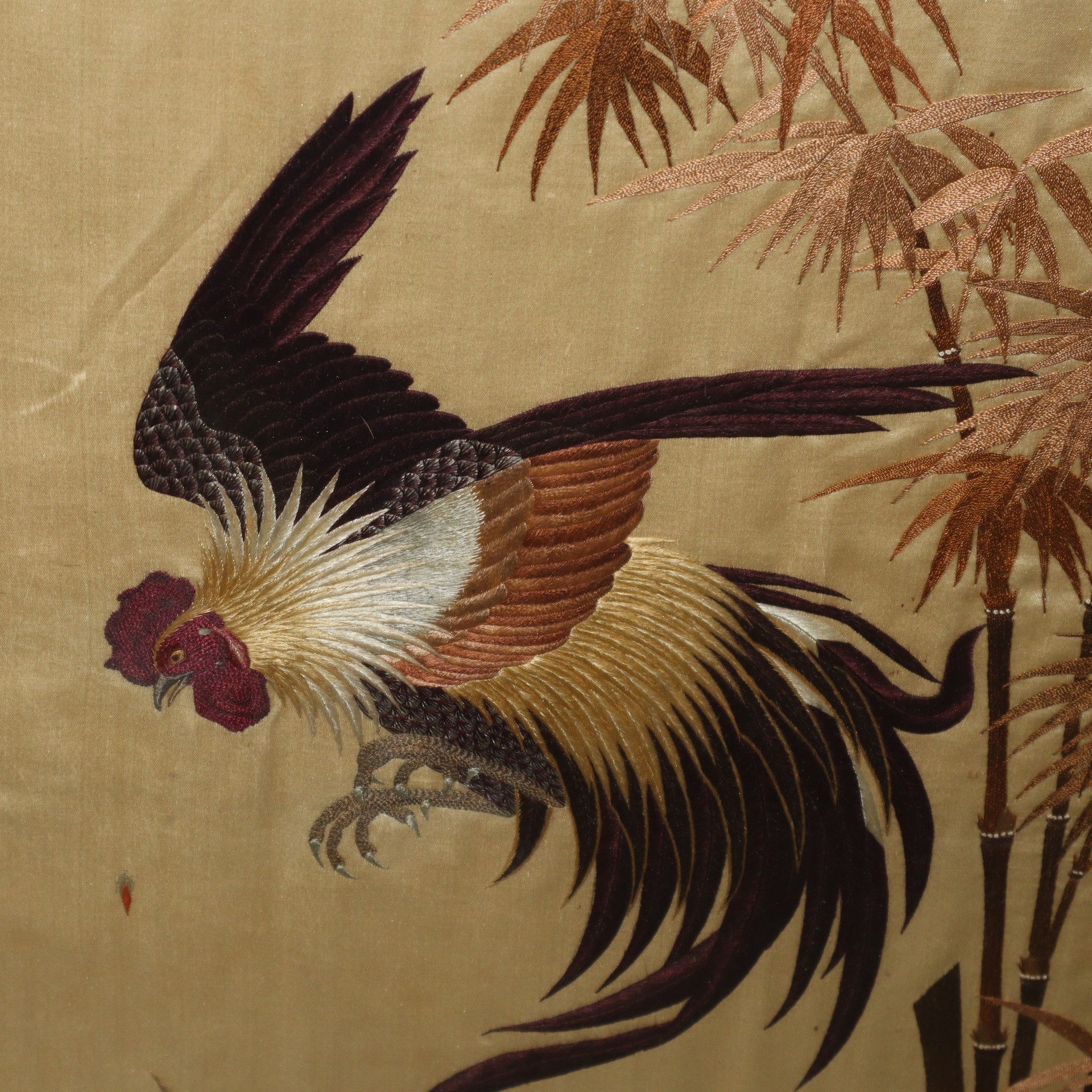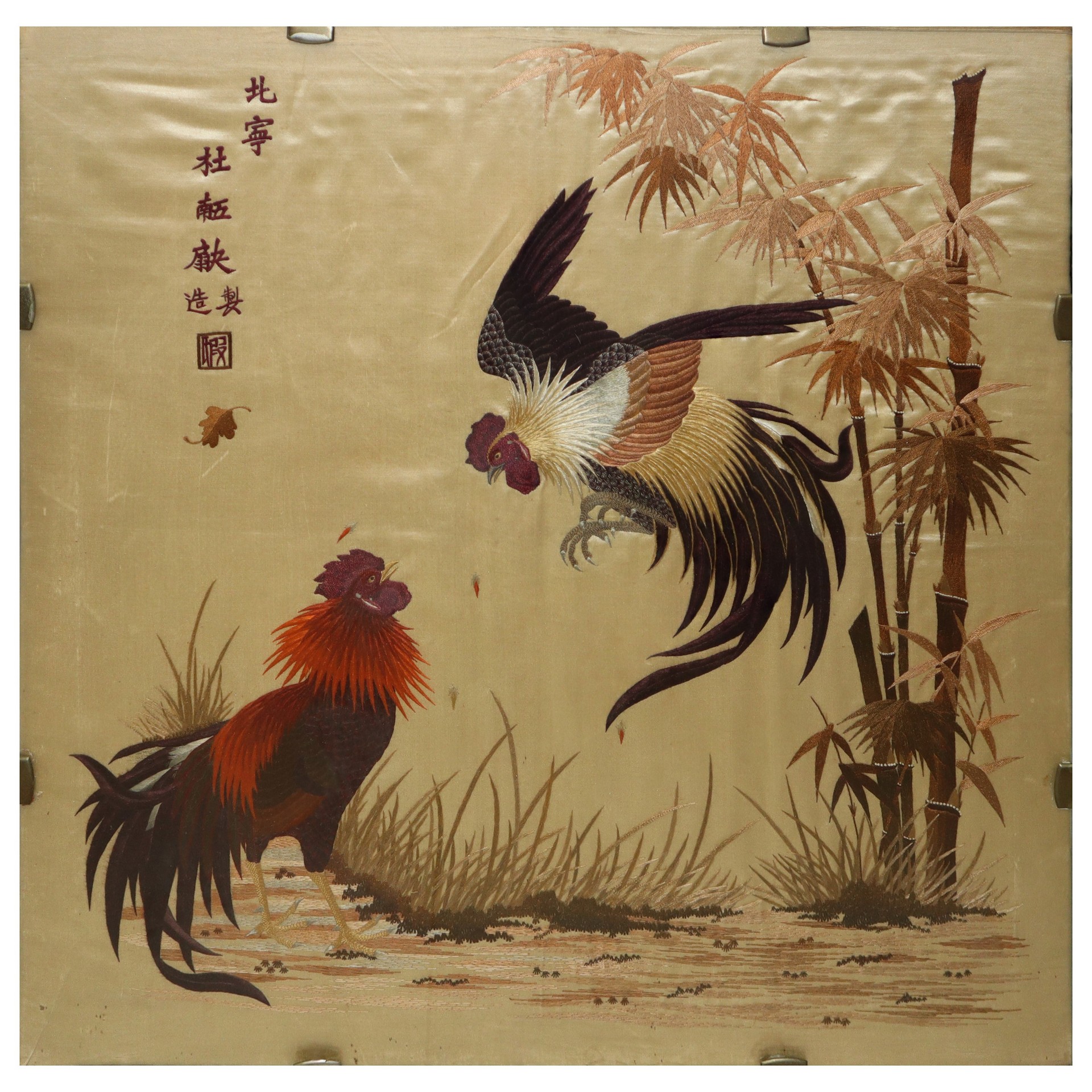 Galli in combattimento., 19° secolo cm 55,5X55,5 Ricamo su seta Ricamo a caratteri orientali al centro a sinistra