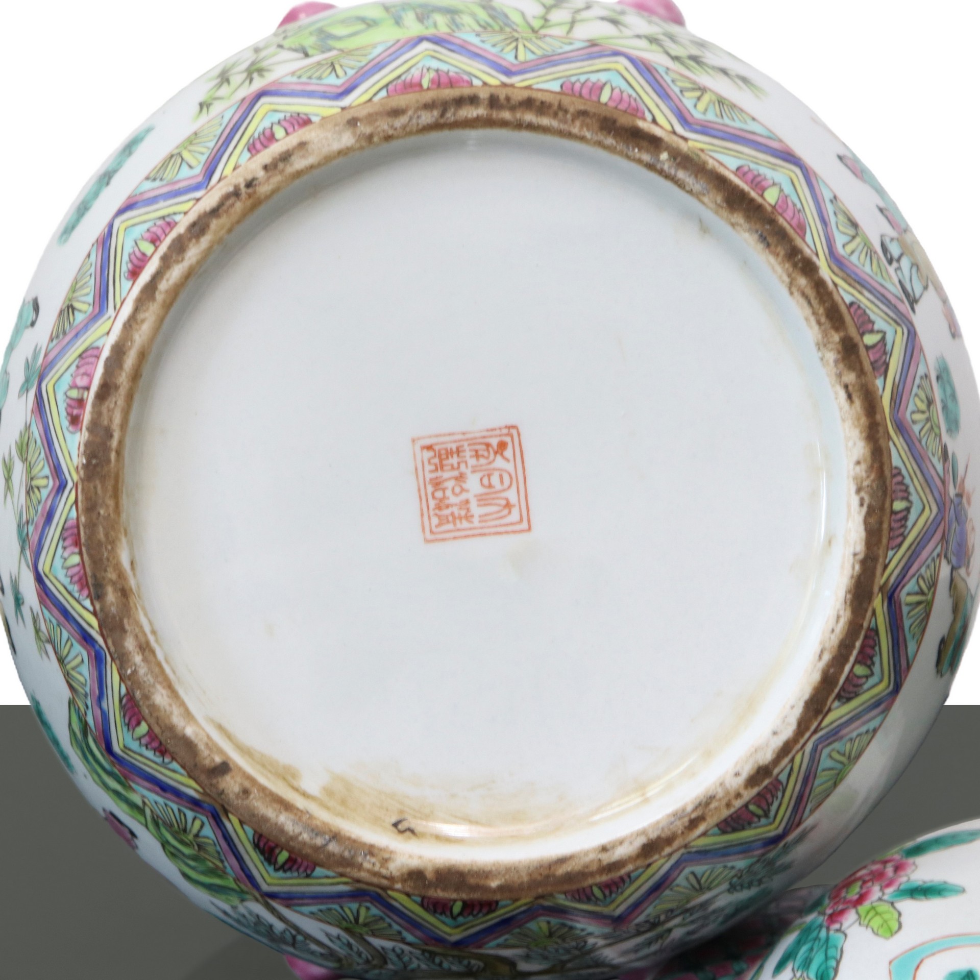 Porta zenzero cinese con coperchio in porcellana con decori policromi, coperchio con pomello a forma di Cane di Pho verde, 20° secolo H cm 22x20.5 Vaso cinese di porcellana con decori di scene di genere. Quattro manici laterali di colore rosa e coperchio con decori floreali, personaggi e pomello che rappresenta un Cane di Pho di colore verde. Timbro alla base.Vaso cinese di porcellana con decori di scene di genere. Quattro manici laterali di colore rosa e coperchio con decori floreali, personaggi e pomello che rappresenta un Cane di Pho di colore verde. Timbro alla base.