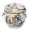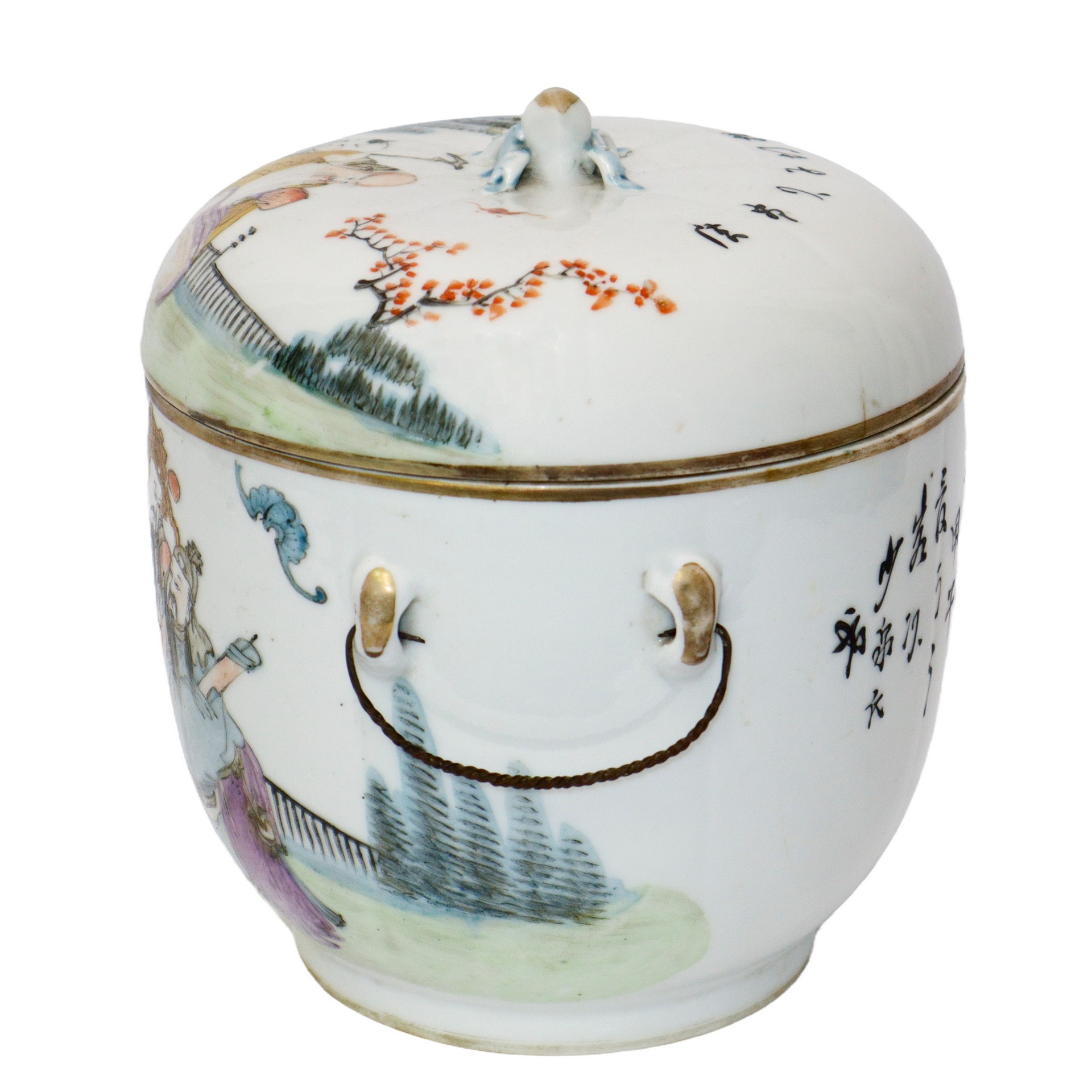 Barattolo di zenzero antico in porcellana cinese con manici in metallo H cm 19.5x17 Barattolo di zenzero in porcellana bianca decorato con personaggi e iscrizioni con caratteri cinesi. Manici in metallo, coperchio con decori e pomello dorato. Timbro con caratteri cinesi alla base.Barattolo di zenzero in porcellana bianca decorato con personaggi e iscrizioni con caratteri cinesi. Manici in metallo, coperchio con decori e pomello dorato. Timbro con caratteri cinesi alla base.