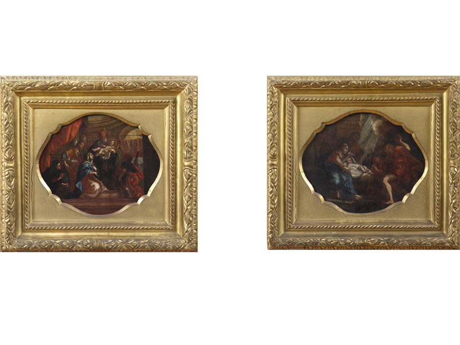Scuola italiana (XVIII secolo) Natività/Presentazione di Cristo al tempio Olio su tela Misure 19x22.5 cm