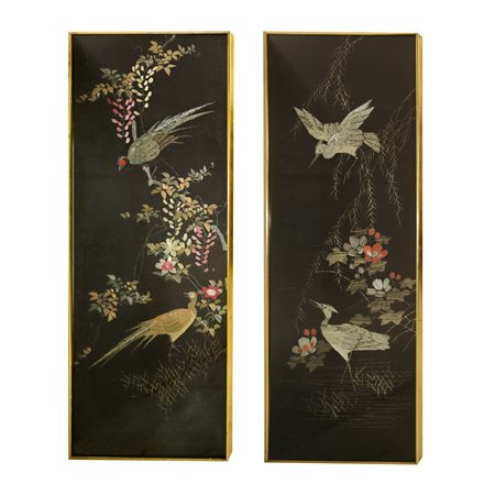 Coppia di dipinti cinesi con uccelli ricamati su seta Cm 120 x 41