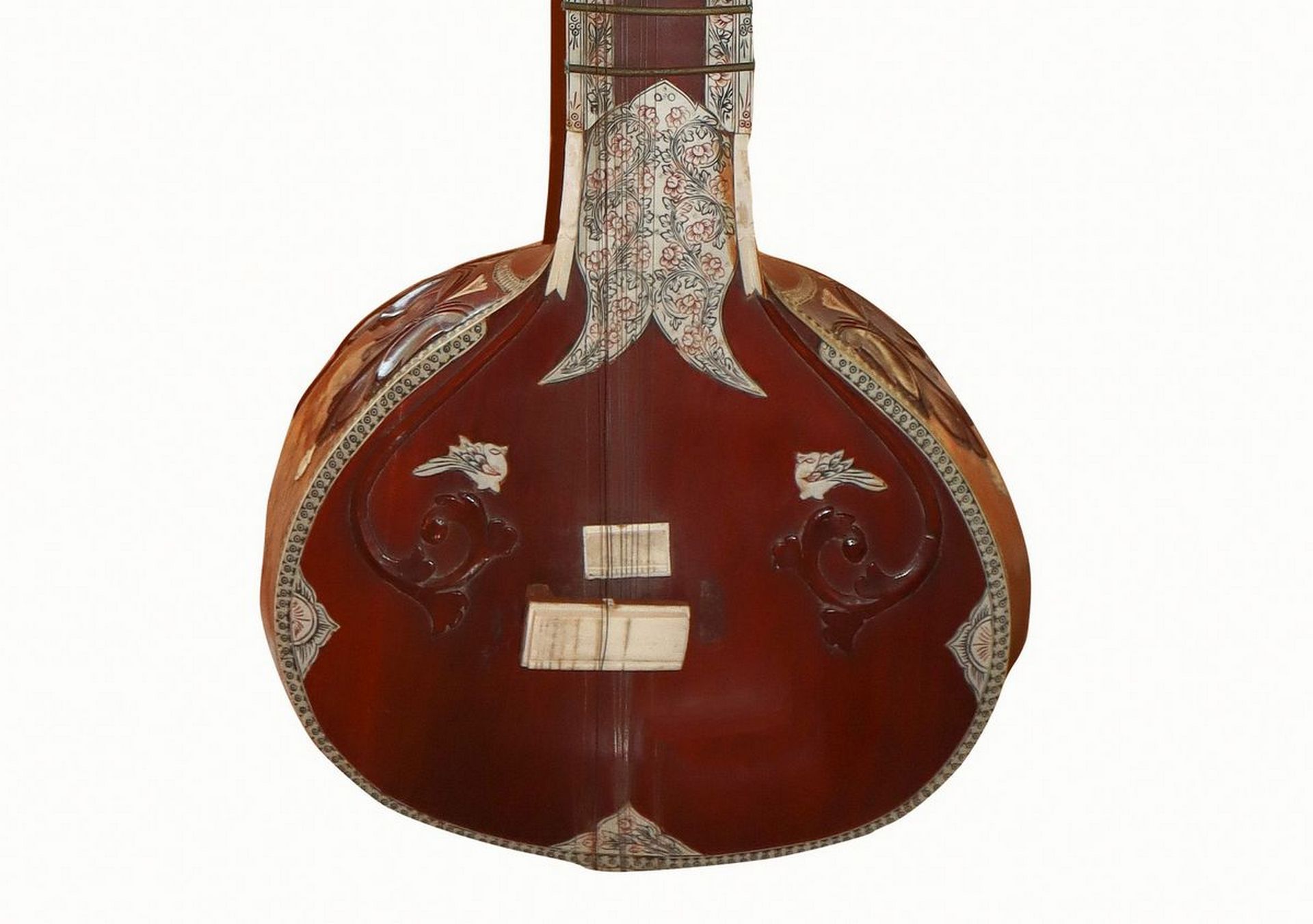 Antico Sitar h cm 125, base cm 35 Strumento musicale indiano, in legno ed inserti in madreperla, avorio. Cassa con zucca ricoperta da intagli di legno a foglie applicate. Da revisionare.Strumento musicale indiano, in legno ed inserti in madreperla, avorio. Cassa con zucca ricoperta da intagli di legno a foglie applicate. Da revisionare.