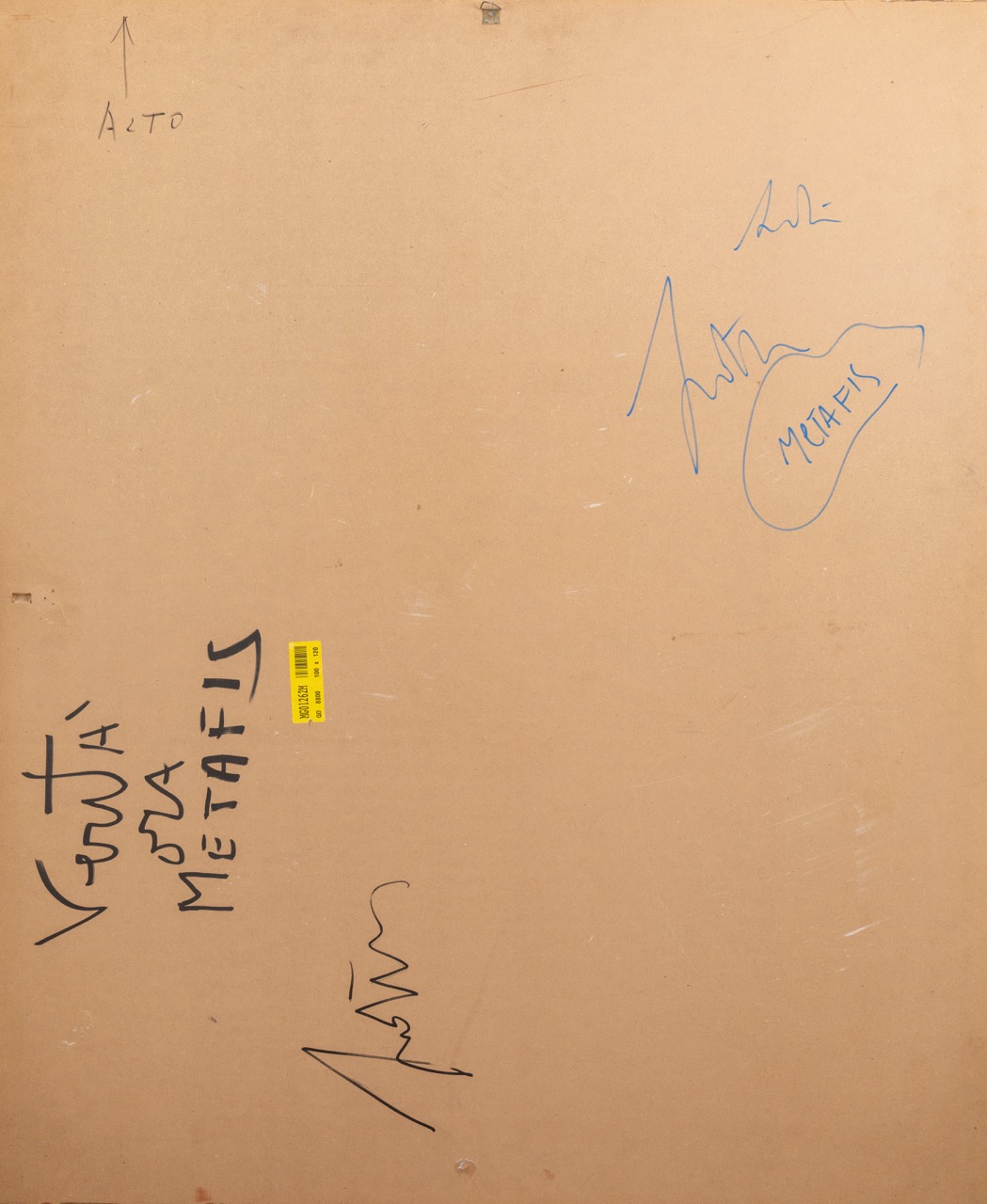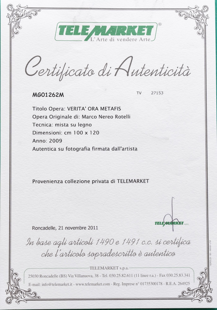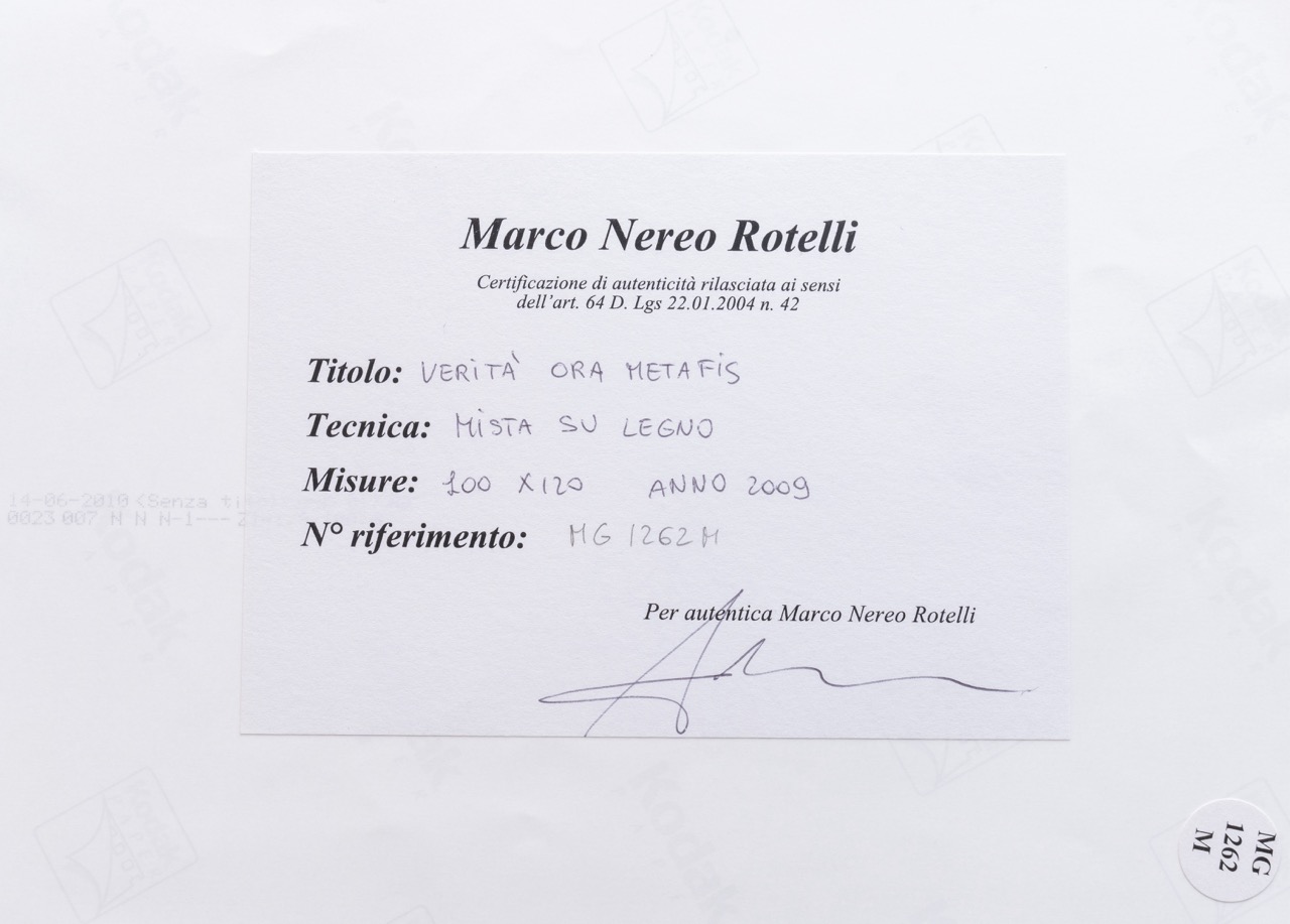 Marco Nereo Rotelli ( Venezia 1955). Verità ora metafis, 2009. Tecnica mista su legno. Titolato e firmato al verso. Autentica su fotografia a firma dell'artista. Cm 100x120.
