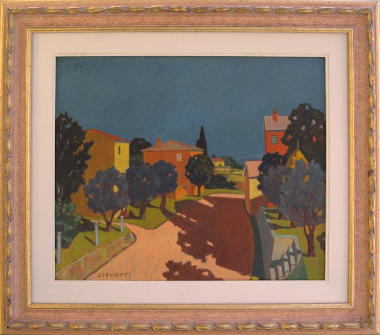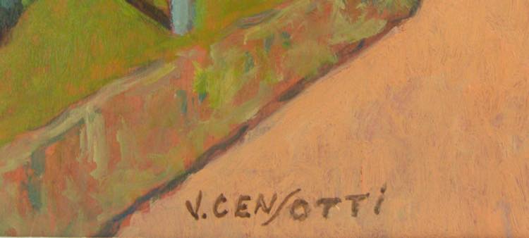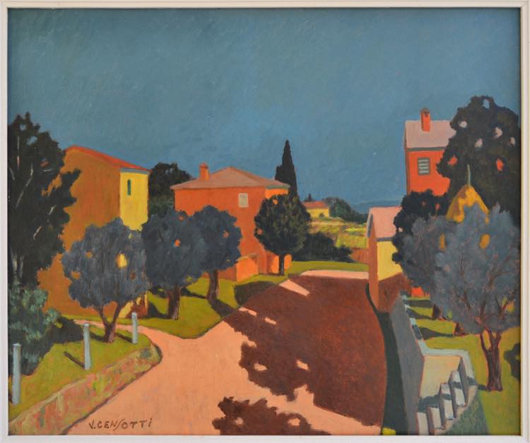 Vincenzo Censotti (Arezzo 1913 - 2005). Paesaggio cittadino. Olio su compensato. Firmato in basso a sinistra CENSOTTI. Con cornice. Cm. 50x60.