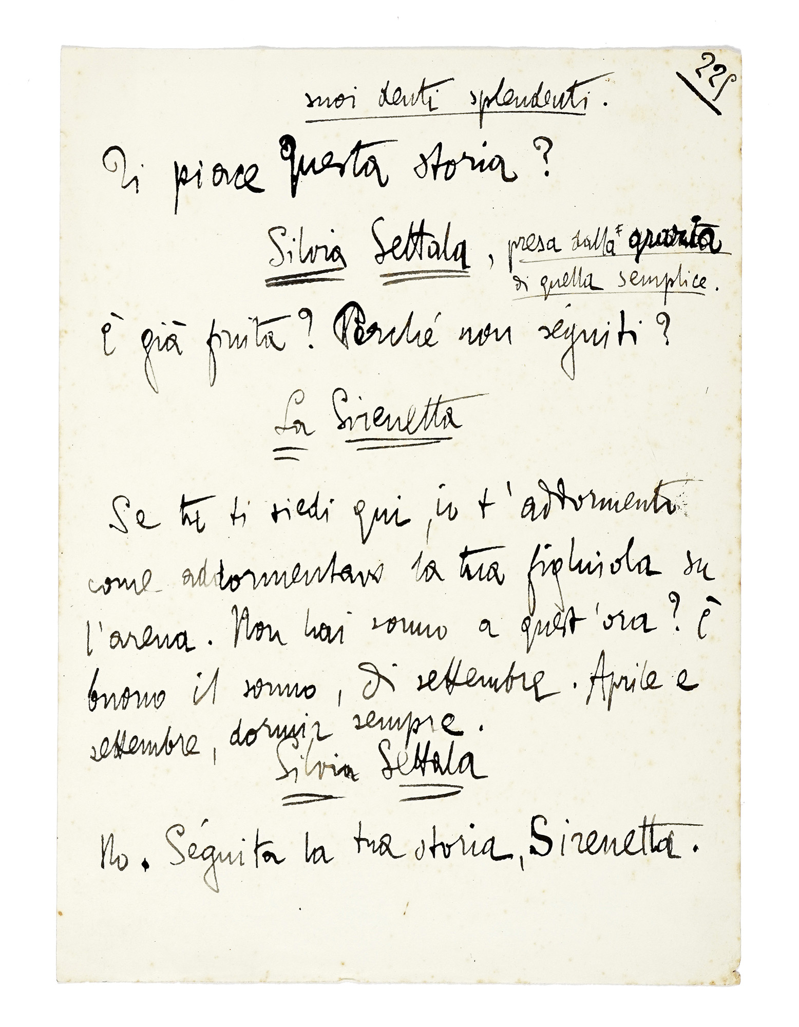 Manoscritto a inchiostro nero. 1 carta scritta al recto. Dimensioni 180x260 mm. (1) Si tratta di un foglio tratto dalla scena I del IV atto de La Gioconda. Incipit: [...] suoi denti splendidi. La Gioconda, unica tragedia dannunziana ambientata in toscana, fu pubblicata nel 1898 e rappresentata per la prima volta l'anno successivo a Palermo, con Eleonora Duse nel ruolo della protagonista Silvia Settala. Il testo presente in questo foglio presenta alcune piccole varianti rispetto alla versione definitiva.