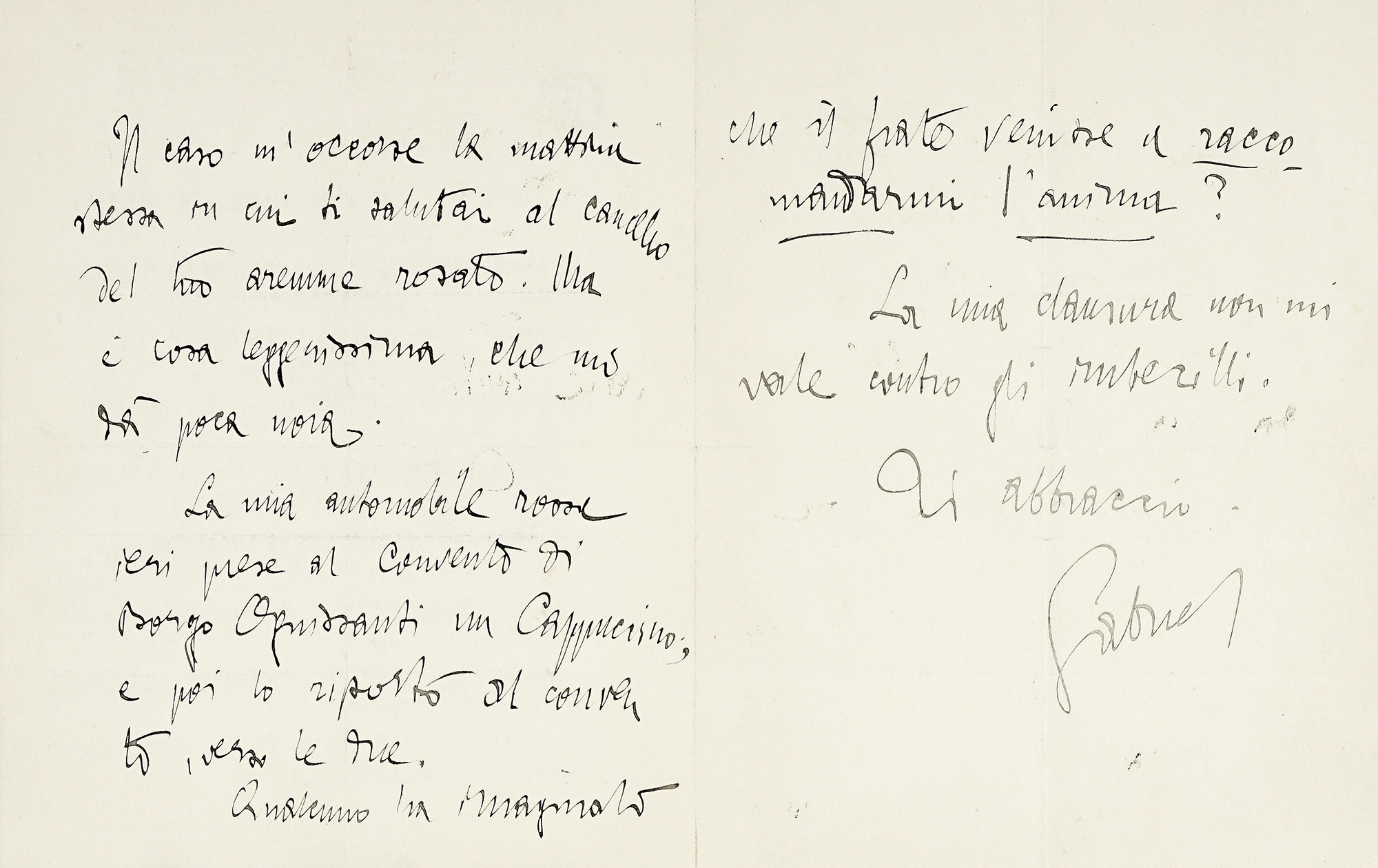 Manoscritto autografo a penna nera. 1 bifolio (scritte 3 pagine). Carta con intestazione Per non dormire. Carta con filigrana. Lettera scritta dalla Capponcina di Settignano (Fi). Dimensioni 170x220 mm. (1) In questa arguta lettera, dopo un piccato sfogo contro i pettegolezzi giornalistici de La Nazione, d'Annunzio parla della sua automobile rossa. Rossa, perché fin da subito per il Vate l'automobile è femminile, come scriverà nel 1926 al Senatore Agnelli. Ricordiamo che a inizio '900 i futuristi, in particolate Marinetti, e Panzini parlavano di automobili solo al maschile. Sulle colline fiorentine d'Annunzio scorrazzava a bordo della sua fiammante Florentia 35 HP rossa, fabbricata proprio a Firenze. Caro amico, perché mai la Nazione fa tanti pettegolezzi e trasforma perfino l'on. Masciantonio [Pasquale] in un cozzone [sensale] di cavalli? E perché afferma che iersera io pranzavo in non so qual villa con amici, mentre pranzai, anzi desinai frugalmente, nel mio solito stallo, solo? Il caso m'occorse la mattina in cui ti salutai al cancello del tuo aremme [harem] rosato [...] La mia automobile rossa ieri prese al Convento di Borgo Ognissanti un Cappuccino [...] Qualcuno ha immaginato che il frate venisse a raccomandarmi l'anima? La mia clausura non mi vale contro gli imbecilli. Ti abbraccio. Gabriel