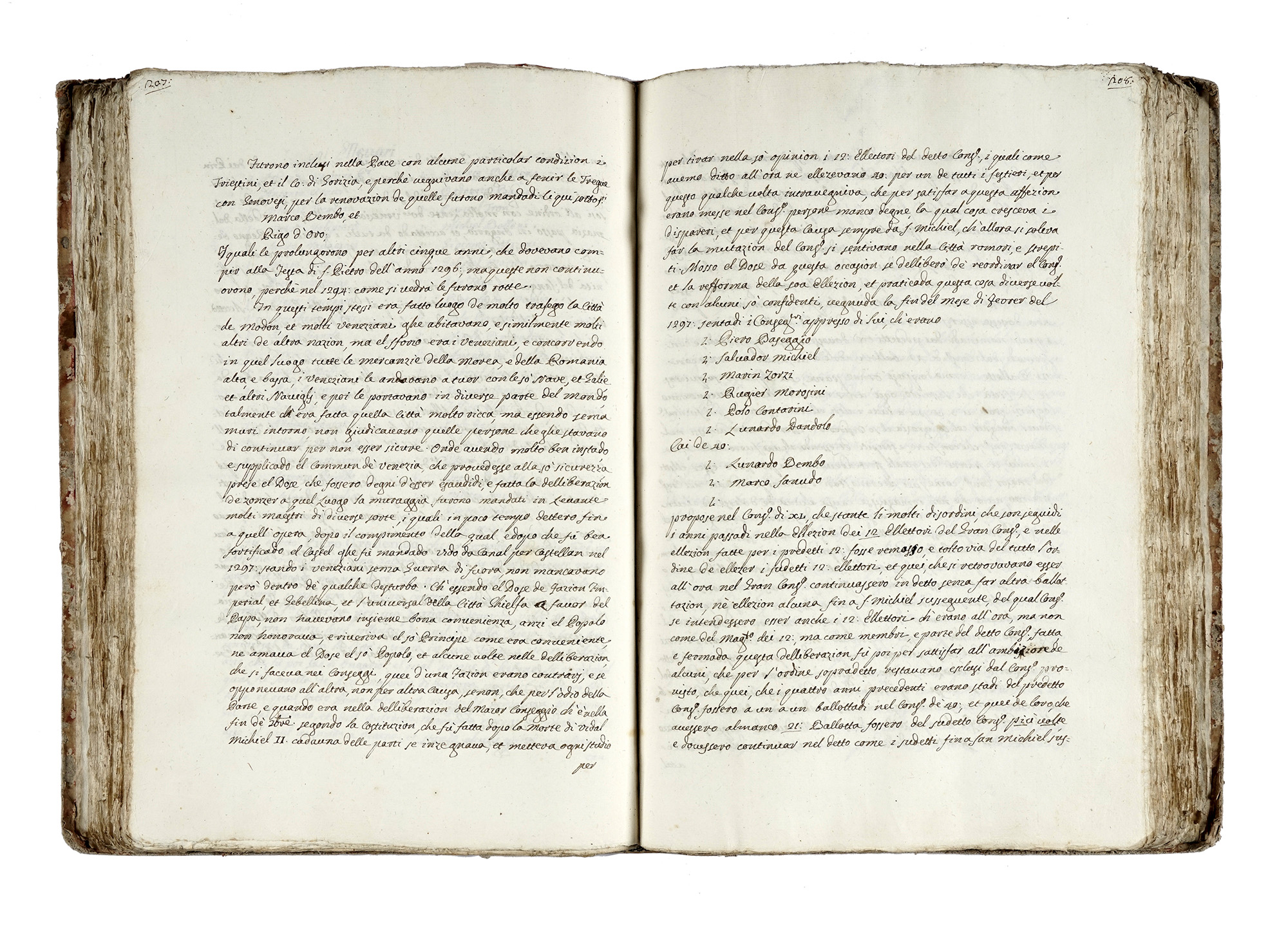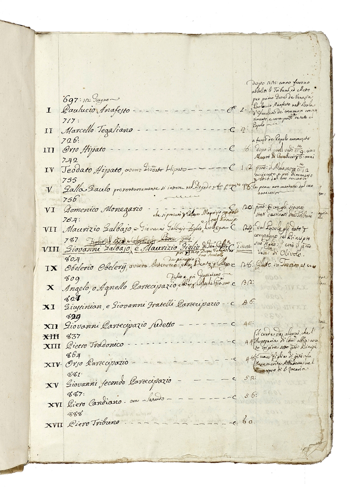 Manoscritti a inchiostro bruno. 2 voll. (320x215 mm). Pagine [10], 471 - [8], 543 cui seguono molte carte bianche. Nel secondo volume sono conservati 2 fascicoli staccati (datati XVII secolo) del medesimo argomento. Carte in barbe ben conservate. Legature in mezza pergamena con alcuni segni del tempo. (2) Il primo volume è composto da: Indice (dal 697, Paoluccio Anafesto fino a Cristoforo Moro, 1471), segue la biogrfaia di ogni doge, talvolta preceduta da una introduzione storica. Il secondo volume è composto da: Indice dei dogi (Da Nicolò Tron all'ultimo doge Lodovico Manin, 1797), seguono liste – suddivise anno per anno e giorno per giorno relative agli scrutini con i nomi dei correttori e di tutti coloro che parteciparono all'elezione dei dogi, e alcune biografie dei dogi.
