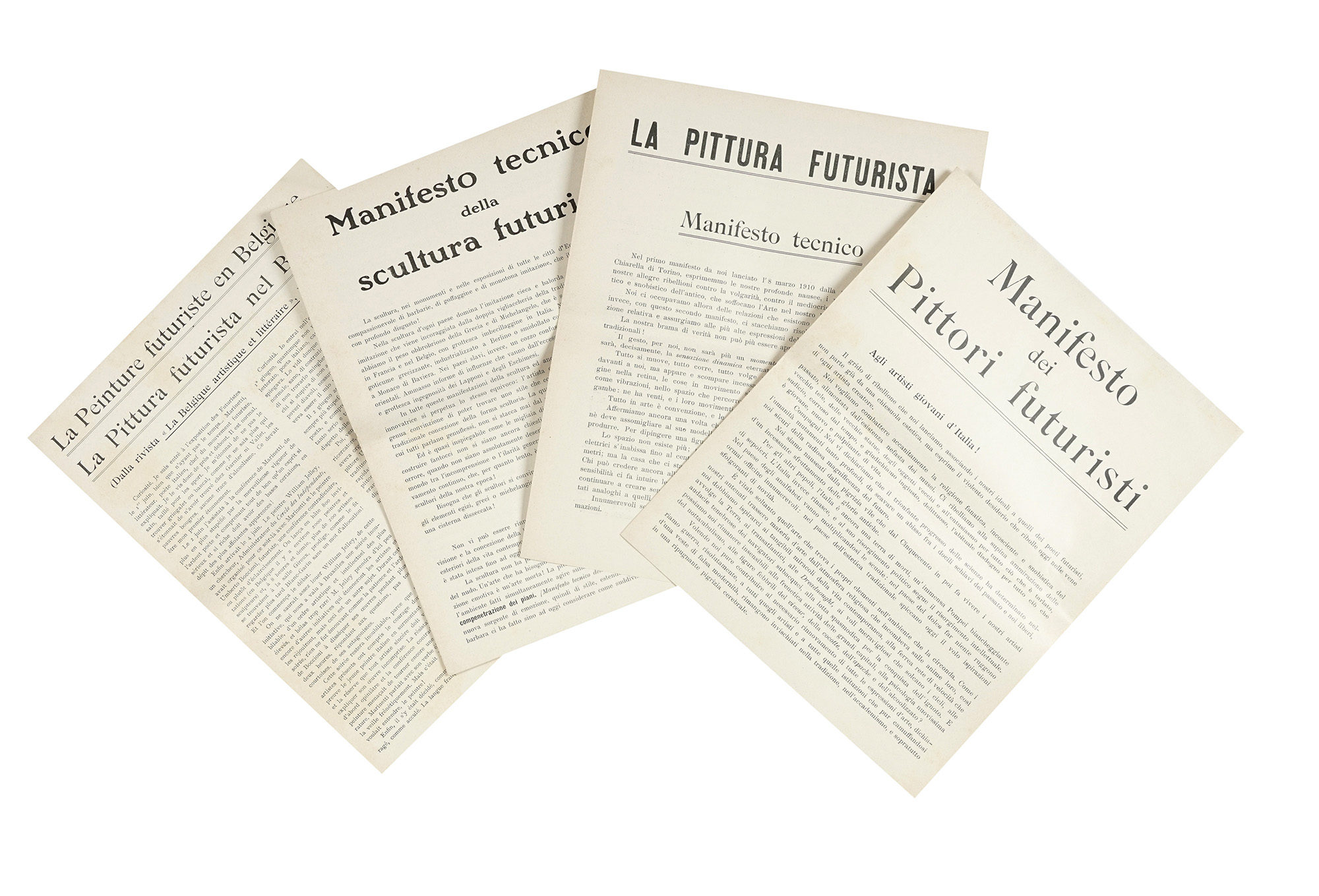 In-4° (mm 290x230). Carte [2], la prima stampata solo al recto. Segno centrale di precedente piegatura e rare fioriture marginali. SI AGGIUNGE: Id., La pittura futurista. Manifesto tecnico. Milano: Poligrafia italiana, 11 aprile 1910. In-4° (mm 290x230). Carte [2]. Segno centrale di precedente piegatura, altrimenti ottima conservazione. SI AGGIUNGE: Id., Manifesto tecnico della scultura futurista. Milano: Direzione del movimento futurista, 11 aprile 1912. In-4° (mm 290x232). Carte [2]. Segno centrale di precedente piegatura e lievi fioriture, ma nel complesso buona copia. SI AGGIUNGE: Nyst Ray, La Peinture Futuriste en Belgique... Milano: Direzione del Movimento Futurista, s.d. [i.e. 1912]. (4) I OPERA: Ristampa successiva della seconda edizione, di questo manifesto sottoscritto da Boccioni, Carrà, Russolo, Balla e Severini (ritirano la loro firma Bonzagni e Romani presenti nella prima edizione), datata 11 febbraio 1910 ma in realtà del 1911 o 1912, come risulta evidente dall'indicazione editoriale della Direzione del Movimento Futurista che corrisponde anche al cambio di indirizzo dell'abitazione di Marinetti, da via Senato a Corso Venezia. Il testo è identico, ci sono solo lievi variazioni nell'impostazione tipografica e viene aggiunto un elenco di aderenti al movimento futurista. II OPERA: Echaurren Pablo, Futurismo. Collaudo 1909-2009 (catalogo di vendita). Milano: Libreria Antiquaria Pontremoli, 2009, 12: «Seconda edizione, firmata dal quintetto definitivo dei pittori futuristi (Boccioni, Carrà, Russolo, Balla e Severini). Il manifesto si conclude a p. [3], mentre in ultima pagina compare l'organigramma della Direzione del Movimento Futurista, suddiviso nelle sezioni di Poesia, Pittura, Musica, Scultura, Azione Femminile, Arte dei Rumori». III OPERA: Edizione originale di questo manifesto scritto da Boccioni dopo il suo ritorno da Parigi, dove l'Autore enuncia in 11 punti i principali concetti della scultura futurista. Futurismo (catalogo di vendita n. 43). Gussago (BS): L'Arengario Studio Bibliografico, 2001, 28; Futurismo (catalogo di vendita n. 100). Firenze: Libreria Salimbeni, 1991, 304; Echaurren Pablo, Futurismo. Collaudo 1909-2009 (catalogo di vendita). Milano: Libreria Antiquaria Pontremoli, 2009, 47. IV OPERA: Importante documento tra le testimonianze più rilevanti della pittura futurista in Belgio.