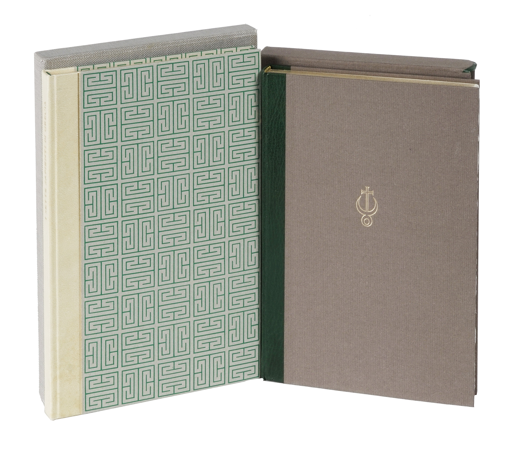 In-8° (mm 235x155). Pagine 172. Bella copia con riproduzione di una medaglia al frontespizio e legatura editoriale in mezza pelle marocchina verde con titoli sul dorso e fregio sul piatto anteriore. Copia in custodia di cartone. Tiratura in 125 copie numerate. SI AGGIUNGE: Sentenze di sette sapienti greci. Verona: Editiones Officinae Bodoni, 1976. In-8° (mm 248x160). Legatura editoriale in mezza pergamena, con piatti in carta decorata e titoli in oro al dorso; entro astuccio originale in tela. (2) II OPERA: Prima edizione italiana delle sentenze nella versione originale greca di Giovanni Stobeo a cura di Enzio Cetrangolo che ha eseguito la traduzione e scritto le biografie dei saggi.