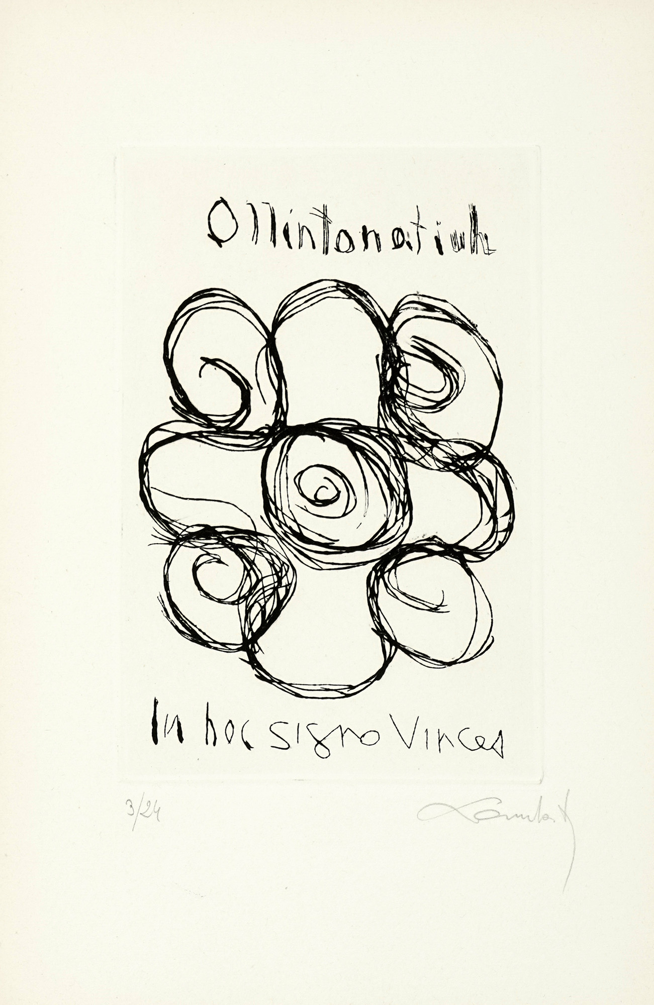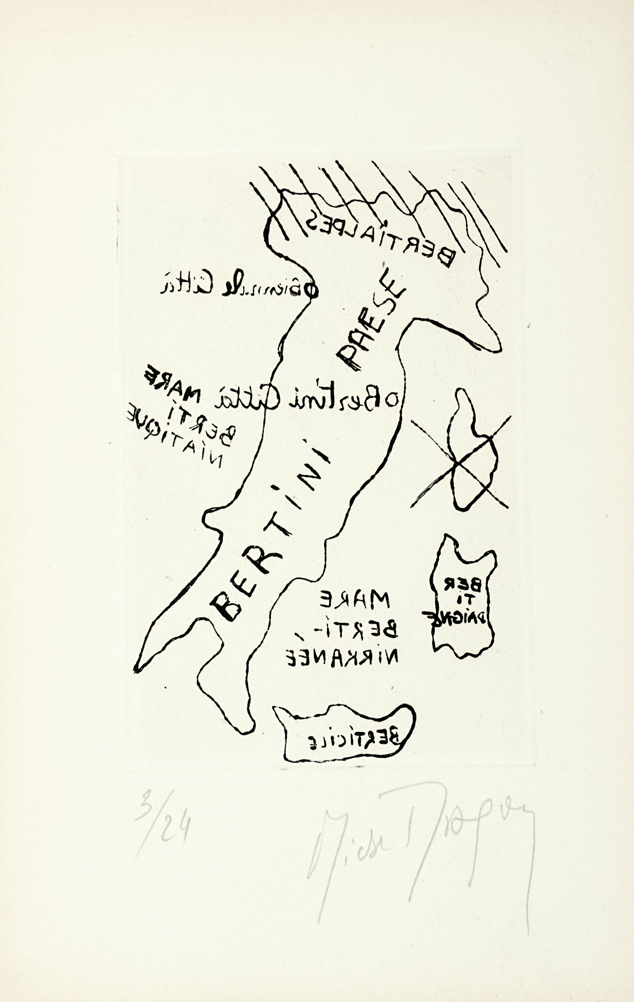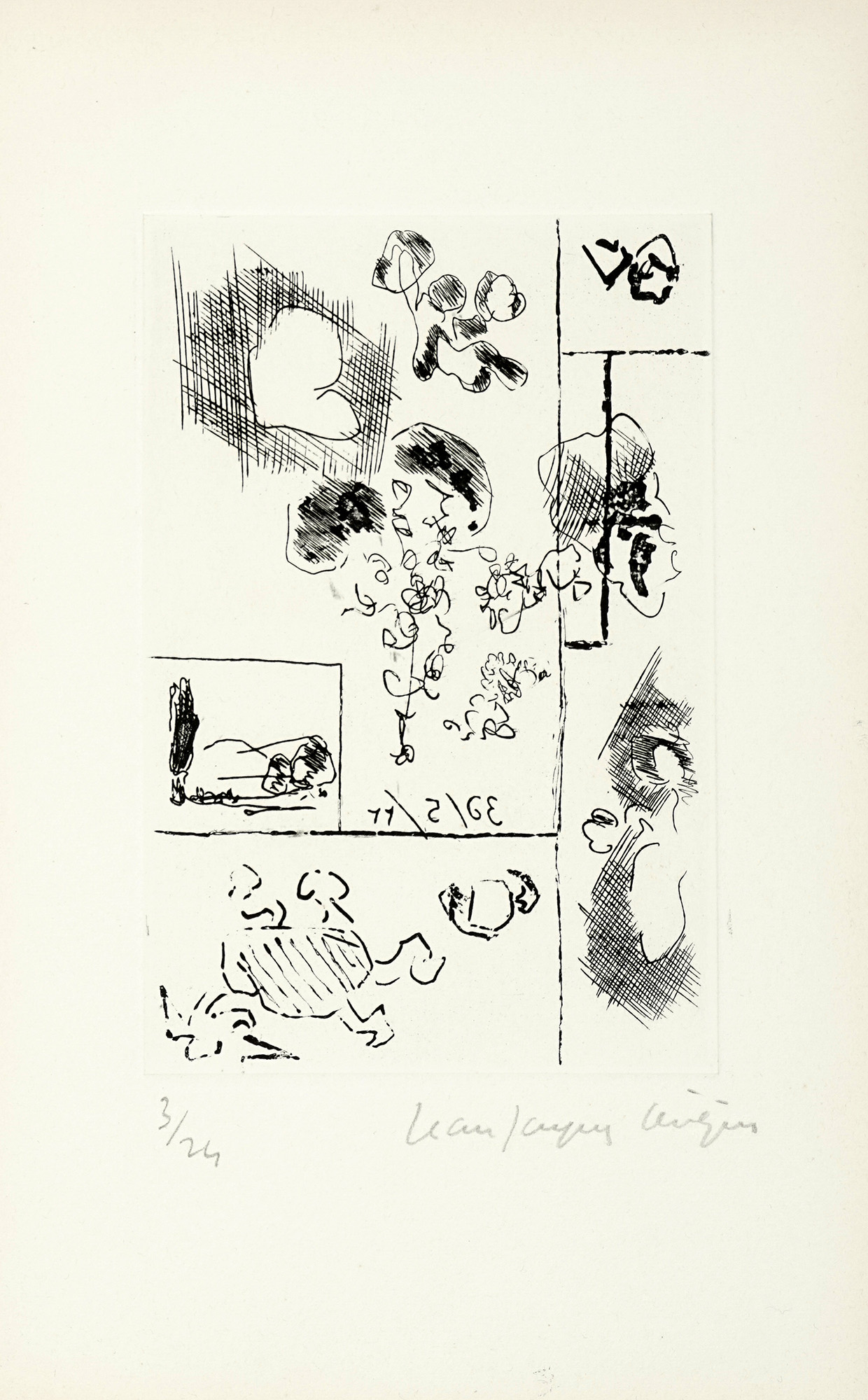 In-8° (mm 255x162). Pagine [50] profusamente illustrate in bianco e nero. Con, sciolte, 5 acqueforti originali, di P.A. Benoît, J.-C. Lambert, J.-J. Lévêque, M. Ragon e P. Restany, tutte firmate e numerate dagli Artisti. Ottima copia in barbe, a bifoli sciolti, perfettamente conservata in brossura originale protetta da velina, con una fotografia di Gianni Bertini al piatto. Minime tracce d'uso alle cerniere, altrimenti buone condizioni. Uno dei 24 esemplari su papier Rives, numerata e firmata al colophon da Bertini e dagli Artisti, su una tiratura complessiva di 36 esemplari. (1) Edizione originale di quest'opera stampata in occasione della mostra di Gianni Bertini al Palais des Beaux-Arts di Bruxelles del 1963.