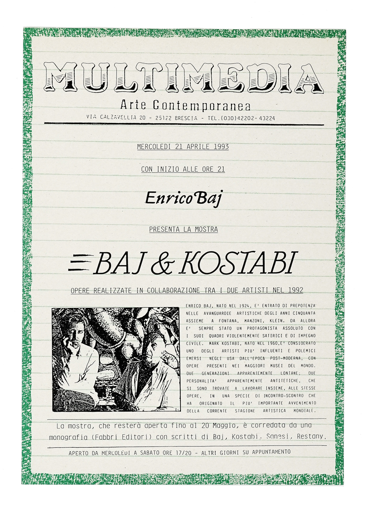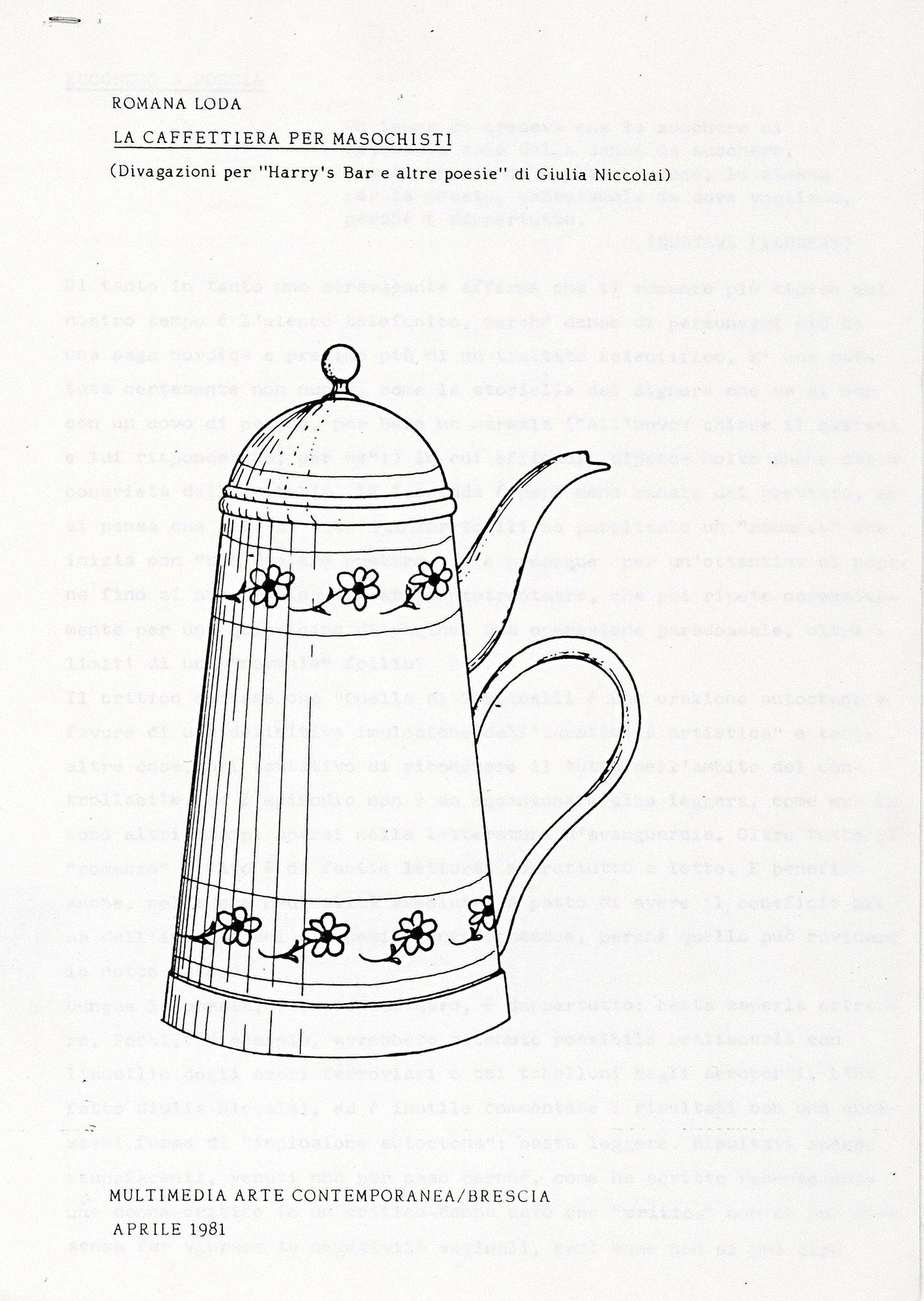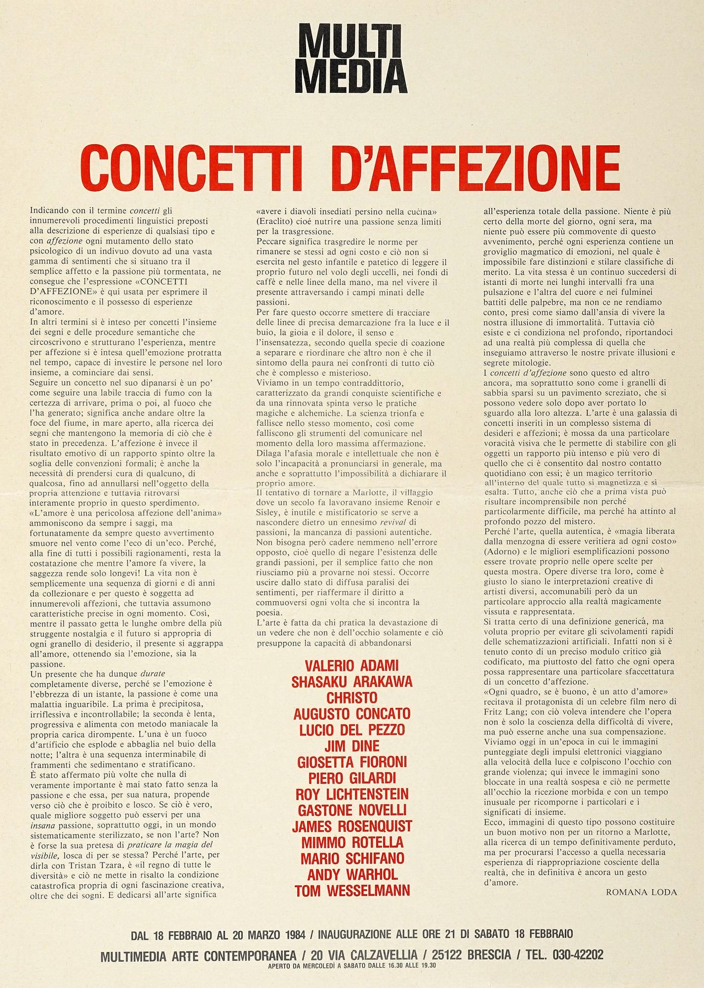 Compongono il lotto: 1) Multimidia. Aspetti dell'arte contemporanea. Brescia: Palazzo Comunale, 19 maggio-15 giugno 1974; 2) Loda Romana, Il volto sinistro dell'arte. 26 ottobre-26 novembre 1977. Firenze: Galleria de Amicis, 1977; 3) Id., L'anello di Moebius. Brescia: Multimedia arte contemporanea 1981; 4) Id., Magma. Rassegna internazionale di donne artiste. Museo Castelvecchio di Verona, febbraio 1977. S.l.: Magma, 1977; 5) Id., Mutimedia. Concetti d'affezione. Manifesto della mostra tenutasi presso la Galleria Multimedia Arte Contemporanea di Brescia dal 18 febbraio al 20 marzo 1984; 6) Progetto. Il compasso negli occhi. Situazione tendenziosa dell'arte italiana vista da Romana Loda. Manifesto di presentazione della rivista Progetto (1979?); 7) Loda Romana, La macchina del piacere perde la molla e diventa persona. (Divagazioni sul libro "Forma di donna" di Carla Cerati). Brescia: Multimedia Arte Contemporanea, 1981 (ciclostile); 8) Id., La caffettiera per masochisti. (Divagazioni per "Harry's Bar e altre poesie" di Giulia Niccolai). Brescia: Multimedia Arte Contemporanea, 1981 (ciclostile). SI AGGIUNGE: Raccolta di oltre 70 documenti, tra lettere, cartoline, collage, biglietti tra la Gallerista e artisti come Claudio Parmiggiani, Libera Mazzoleni, Luciano Ori, Lucio del Pezzo, Verita Monselles, Wanda Benatti, Beatriz Miller, Augusto Concato e molti altri. In gran parte originali, manoscritti o in ciclostile, alcuni in fotocopia. (122) Romana Loda, gallerista e curatrice di mostre, è stata un personaggio chiave nella diffusione dell'arte delle donne in Italia negli anni Settanta promuovendo il lavoro di numerose artiste, sia mediante la sua galleria (la Multimedia di Erbusco di Brescia), sia attraverso esposizioni in spazi pubblici e privati, quali Coazione a mostrare (1974), Magma (1975; 1976; 1977), Altra misura (1976) e Il volto sinistro dell'arte (1977), alle quali presero parte alcune delle artiste più significative e affermate del panorama artistico europeo (Niki de Saint-Phalle, Gina Pane, Marina Abramović, Annette Messager, per citarne alcune), nonché le figure di spicco della neoavanguardia italiana del periodo, operanti in campi di ricerca assai diversi (dall'arte cinetico-programmata, all'area concettuale, dalla poesia verbovisiva alla performance) come Marina Apollonio, Mirella Bentivoglio, Tomaso Binga, Renata Boero, Dadamaino, Giosetta Fioroni, Lucia Marcucci, Libera Mazzoleni, Verita Monselles, Grazia Varisco, Nanda Vigo e molte altre.
