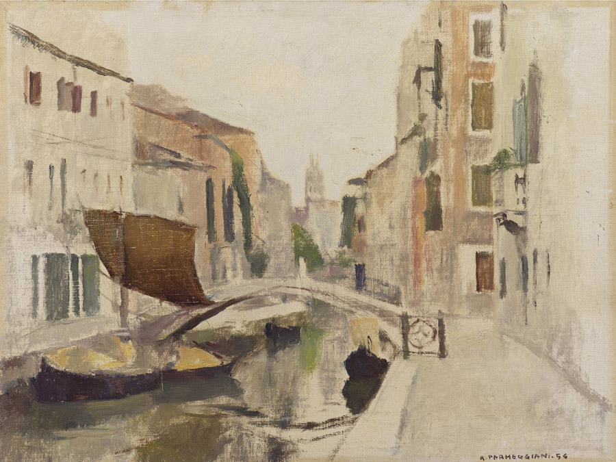 Romano Parmeggiani (Venezia 1930-Santoro 2002) Venezia Olio su tela Firmato e datato 1956 Senza cornice Misure 30x40 cm
